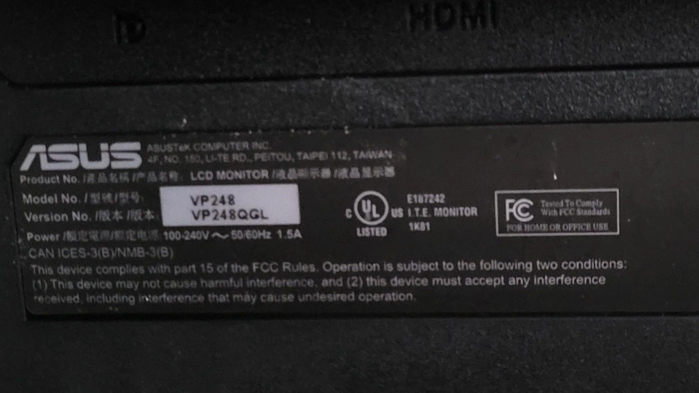 ASUS LCD monitor in EUC Model #: VP248QG Screen Size: 24-inch screen. Power: 100-240V ~ 50/60Hz 1.5A. Includes power cable. Purchased at staples 2 years ago: https://www.staples.ca/products/2973621-en-asus-238-ips-frameless-monitor-with-amd-freesync-technology-va24ehey?CID=PS:GS:CA:::::pla:21203669721&CampaignID=21203669721&gad_source=1&gclid=CjwKCAiAzPy8BhBoEiwAbnM9O8F7TPCq1EvqJd6Ddq3FFUn3WvgCun2Bh0gjloUd4raXMRheDejcbRoC-3MQAvD_BwE Comes from a smoke & pet free home.