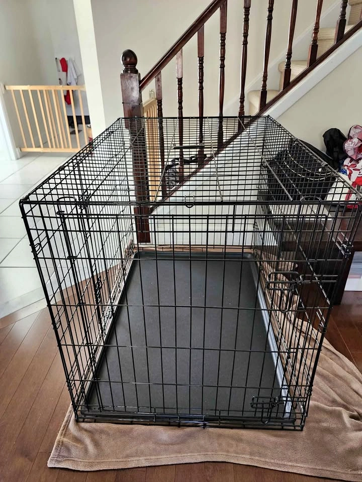 XLarge Dog Crate. 42"L x 28" W x 30"H. 2 door entry, removable bottom tray, divider wall (not shown) included to make area smaller for puppy, removable as puppy grows. Folds easily for transport and portability. Was removed from box and set up in our non-smoking home (as pictured). Original box available. Pick up at Renforth and Eglinton, Etobicoke or possible meet up in E Mississauga or Milton, depending on my schedule.