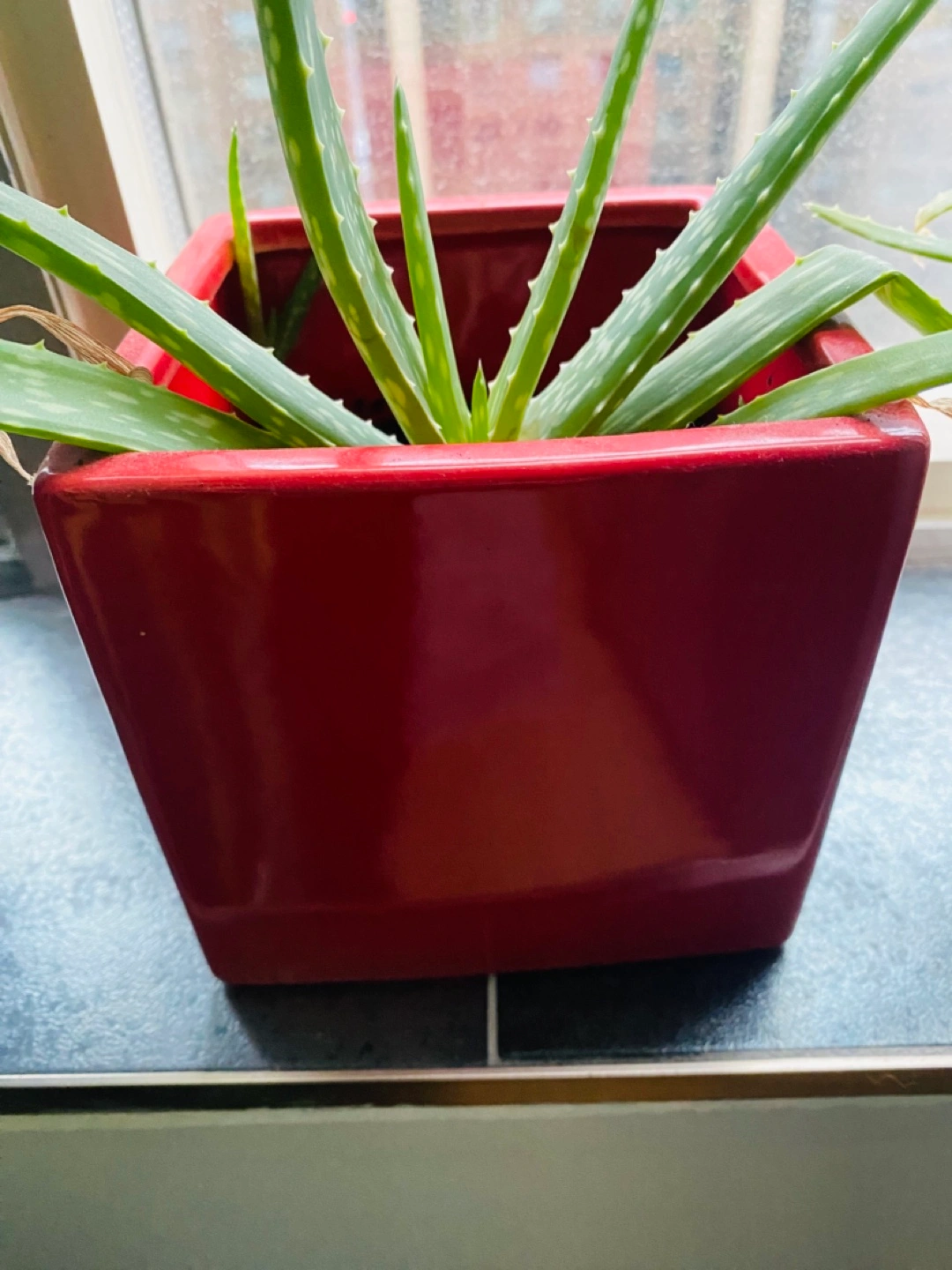 Healthy aloe vera plant. Planted in a vivid red square ceramic pot. Stylish and cozy addition to any home. Pot measures 5 x 5 inches. Plant is 10 inches tall. Downsizing my extensive plant collection π± πͺ΄ π΄ - no bugs - has always been an indoor plant - clean and healthy - ceramic red pot included ($10 value)
