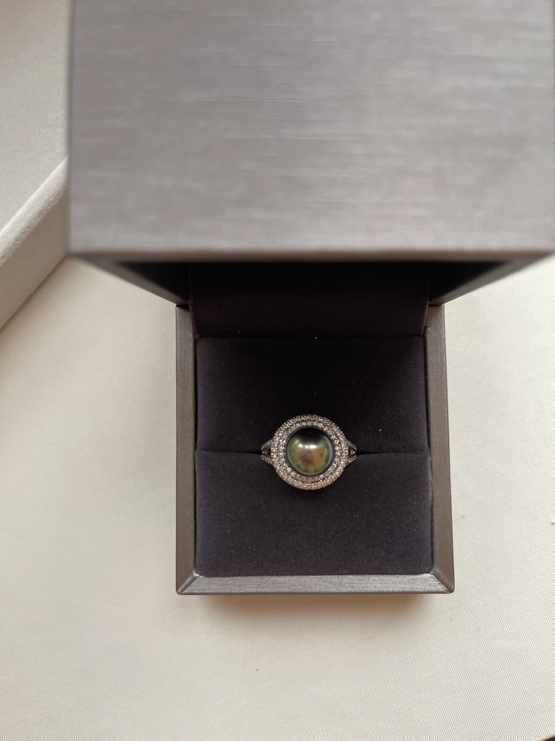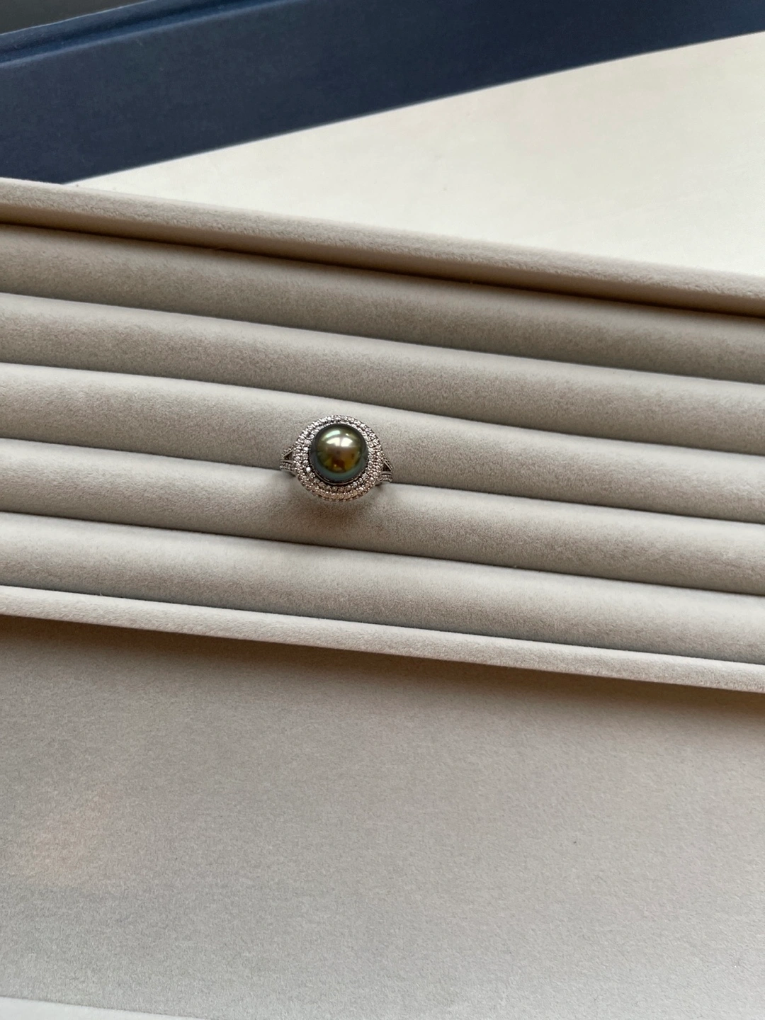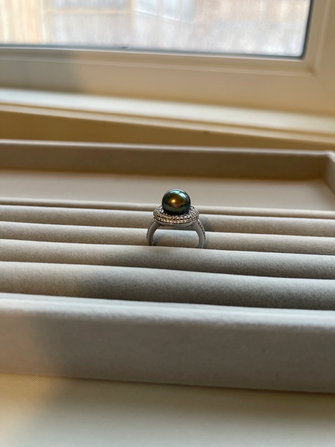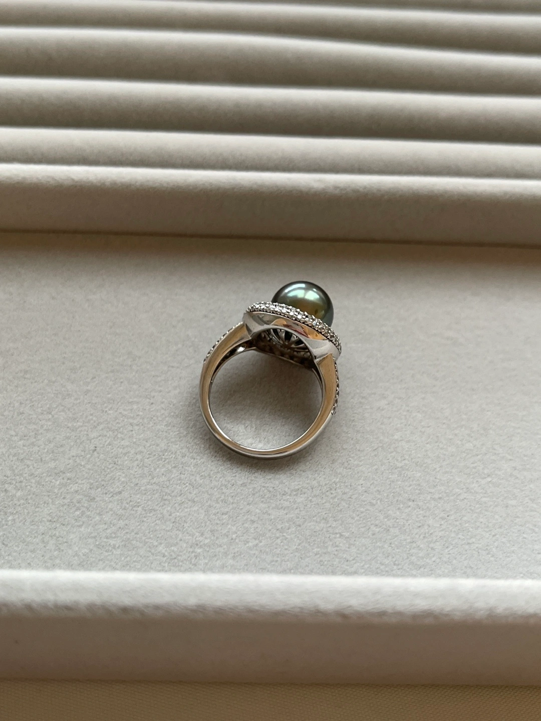 Stunning ring features a Tahitian Black pearl. Authentic Tahitian Pearl, not dye. Good lustre and vibrant dark green high quality Pearl. Pearl size 10mm. Surrounded by a halo of sparkling cubic zirconia. 925 Silver band. Perfect statement piece. Decent ring box included
