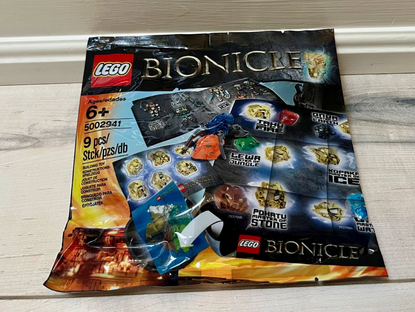 LEGO 5002941 Bionicle Hero Pack is a 9 piece Bionicle promotional set released in 2015. It features a translucent orange mask, buildable Skull Spider, booklet with comic strip and character line-up, sticker sheet, and a double-sided poster with precious masks and an island map. New, unopened, sealed bag.
