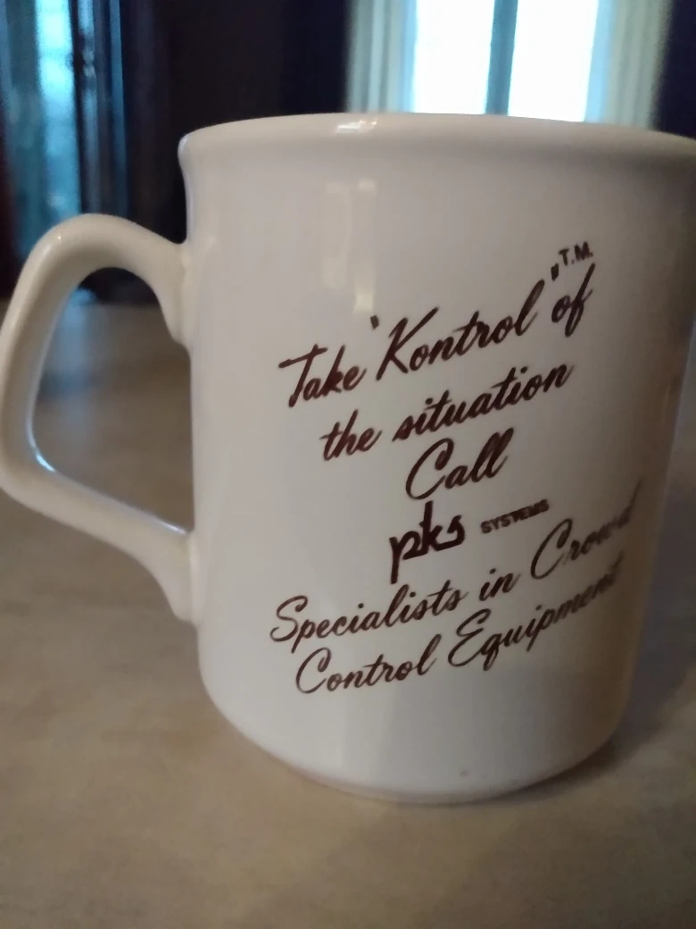 White ceramic mug. Brown print features company logo and slogan. Crowd control equipment specialists. Shows queuing system graphic.