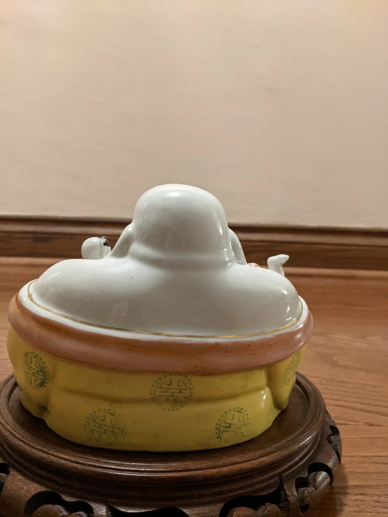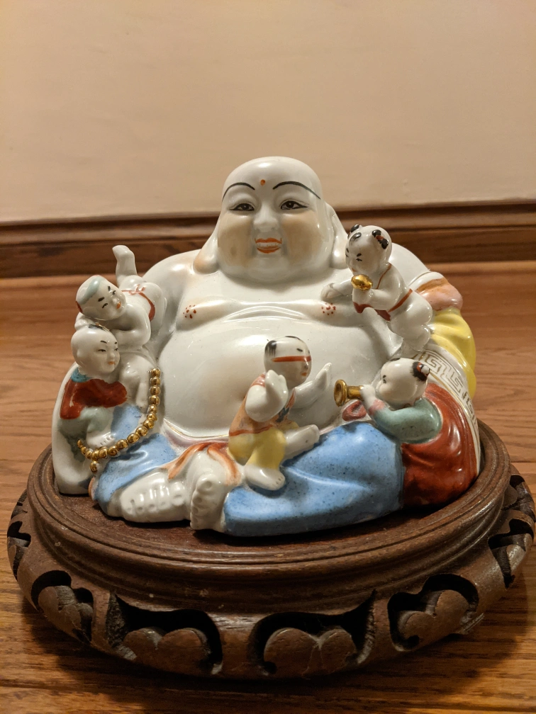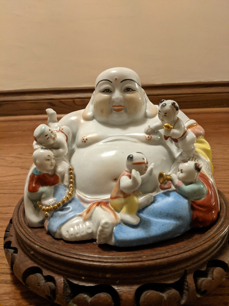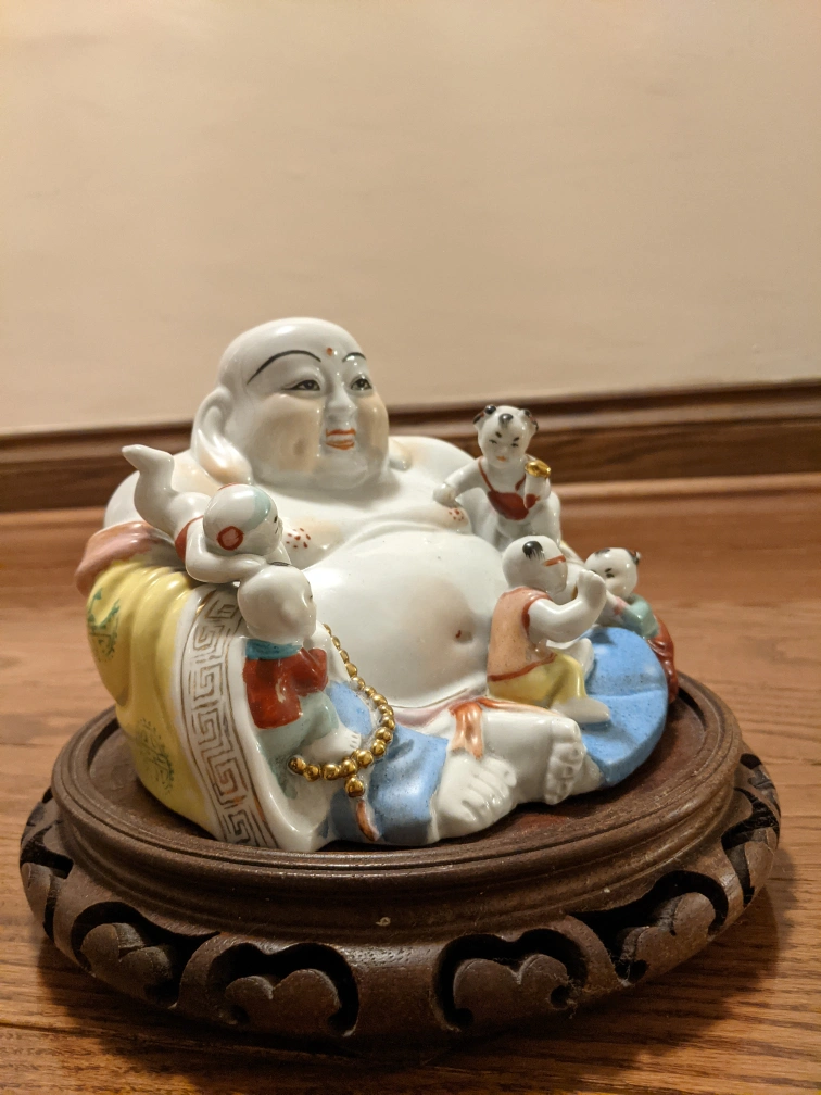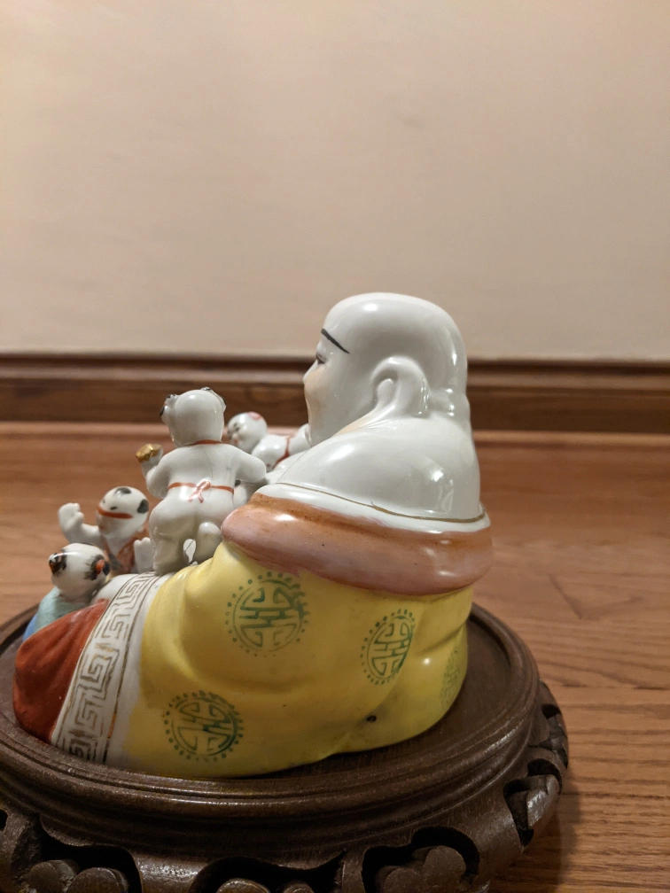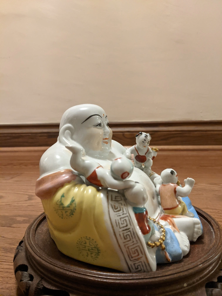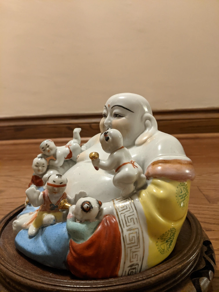 Vintage porcelain figurine. Depicts a laughing Buddha surrounded by children. Features colourful clothing and intricate detailing. Sits on a wooden stand. Collectible item. Approximately 8" diameter, 6" tall.