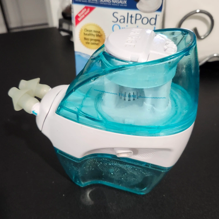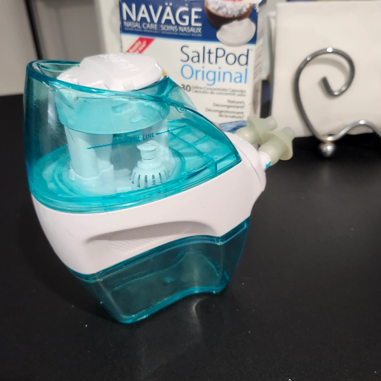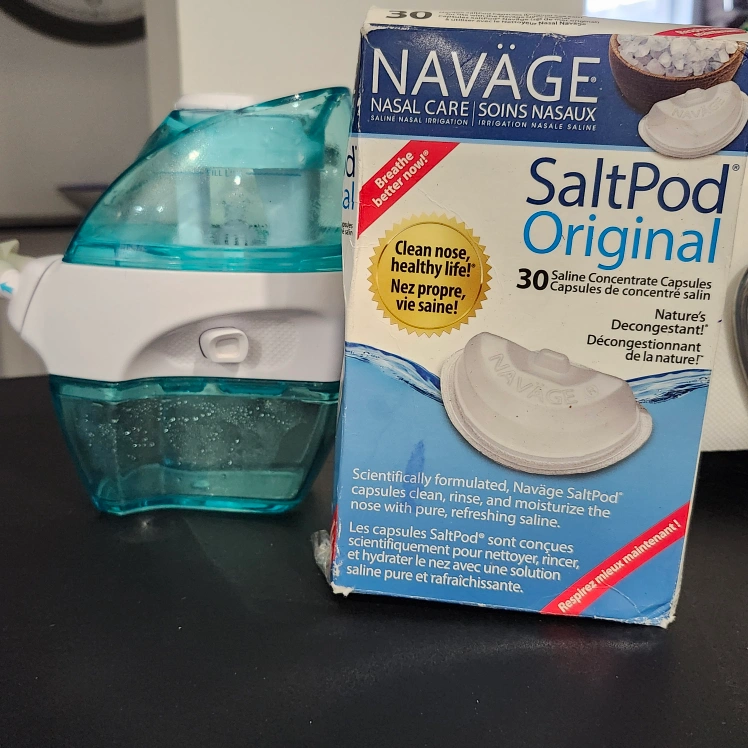 Used Naväge nasal irrigation system. Includes 30 original SaltPod saline concentrate capsules. Clean, healthy life. Teal and white plastic. Good condition.