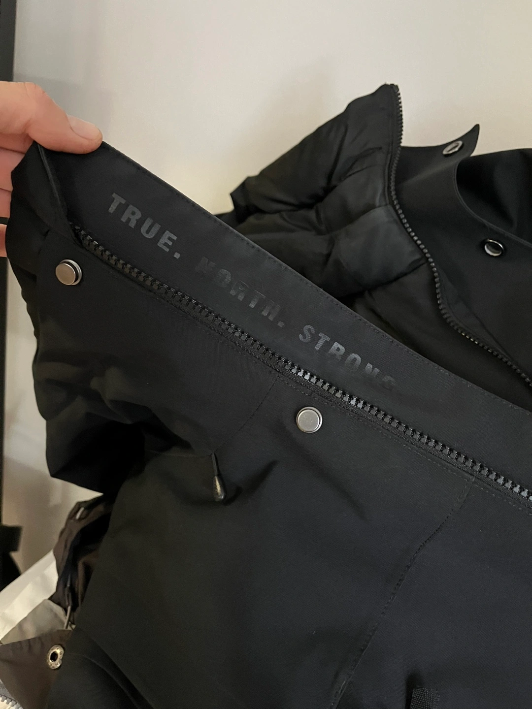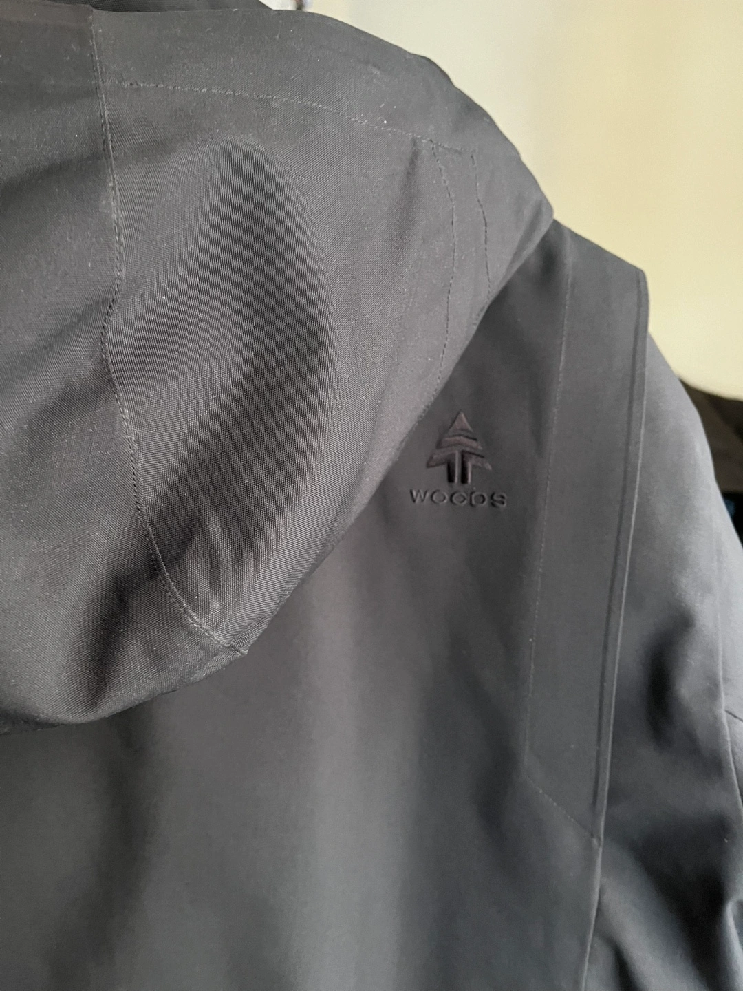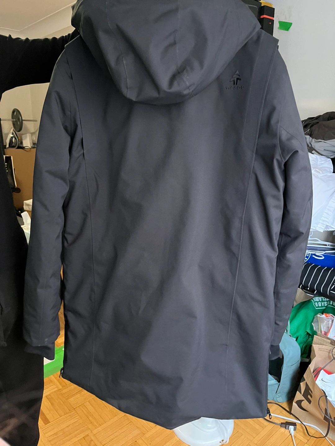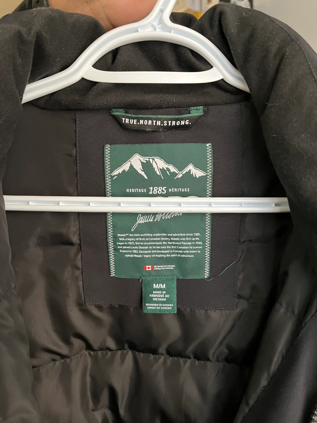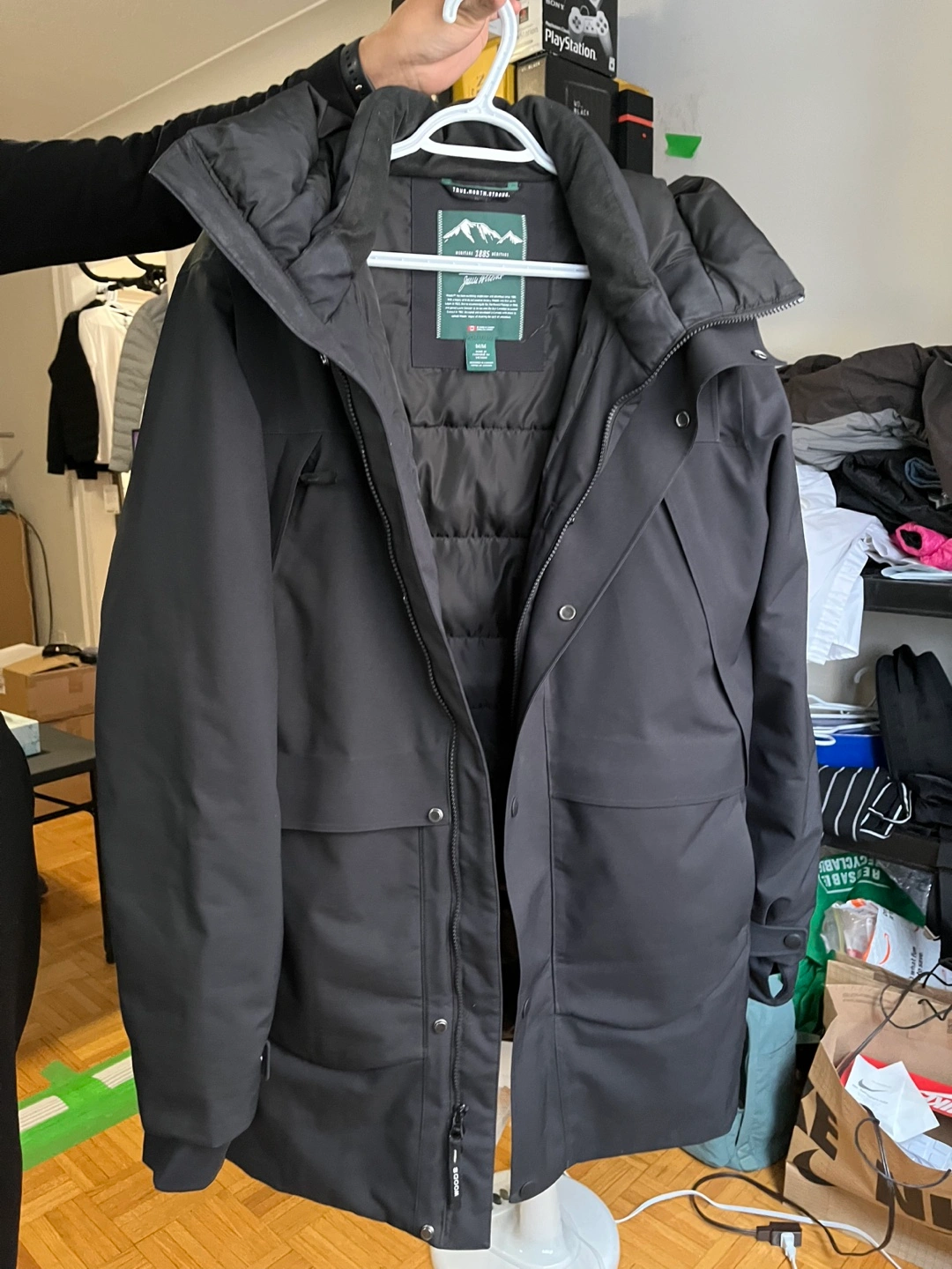 Men's size medium black parka. Warm and stylish. Features a hood and multiple pockets. Excellent condition.