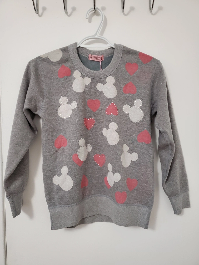 Cute grey sweatshirt featuring pink and white Mickey Mouse heads and hearts. Long sleeves, crew neck. Great for casual wear.