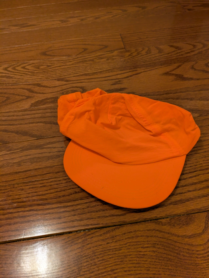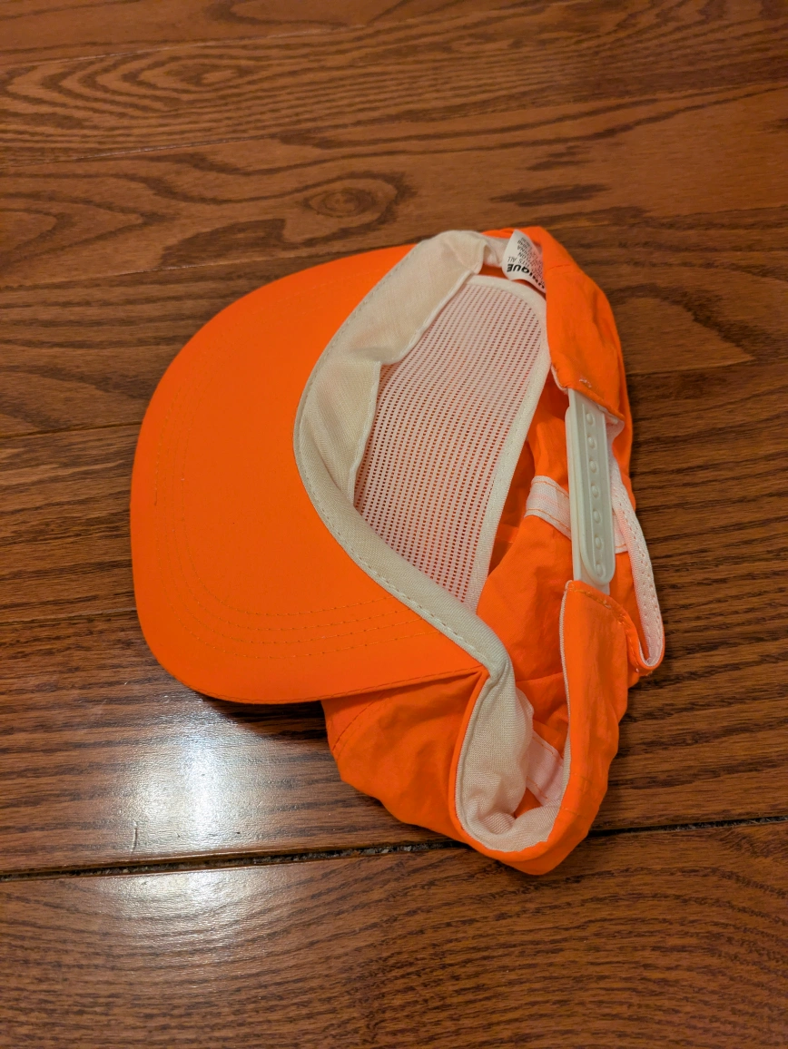 Lightweight orange baseball cap. Features a mesh back and adjustable plastic closure. Great for outdoor activities.