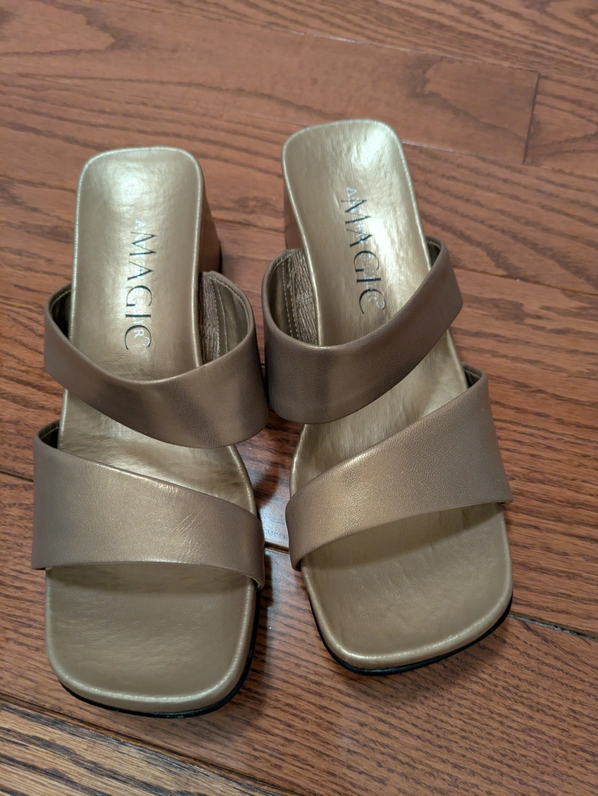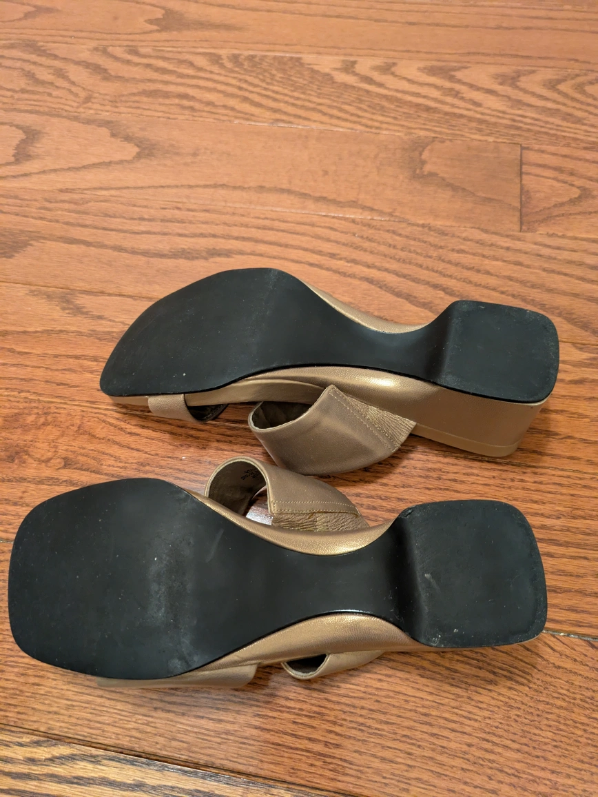 Pair of gold low wedge sandals. Double straps. Size not shown. New condition.