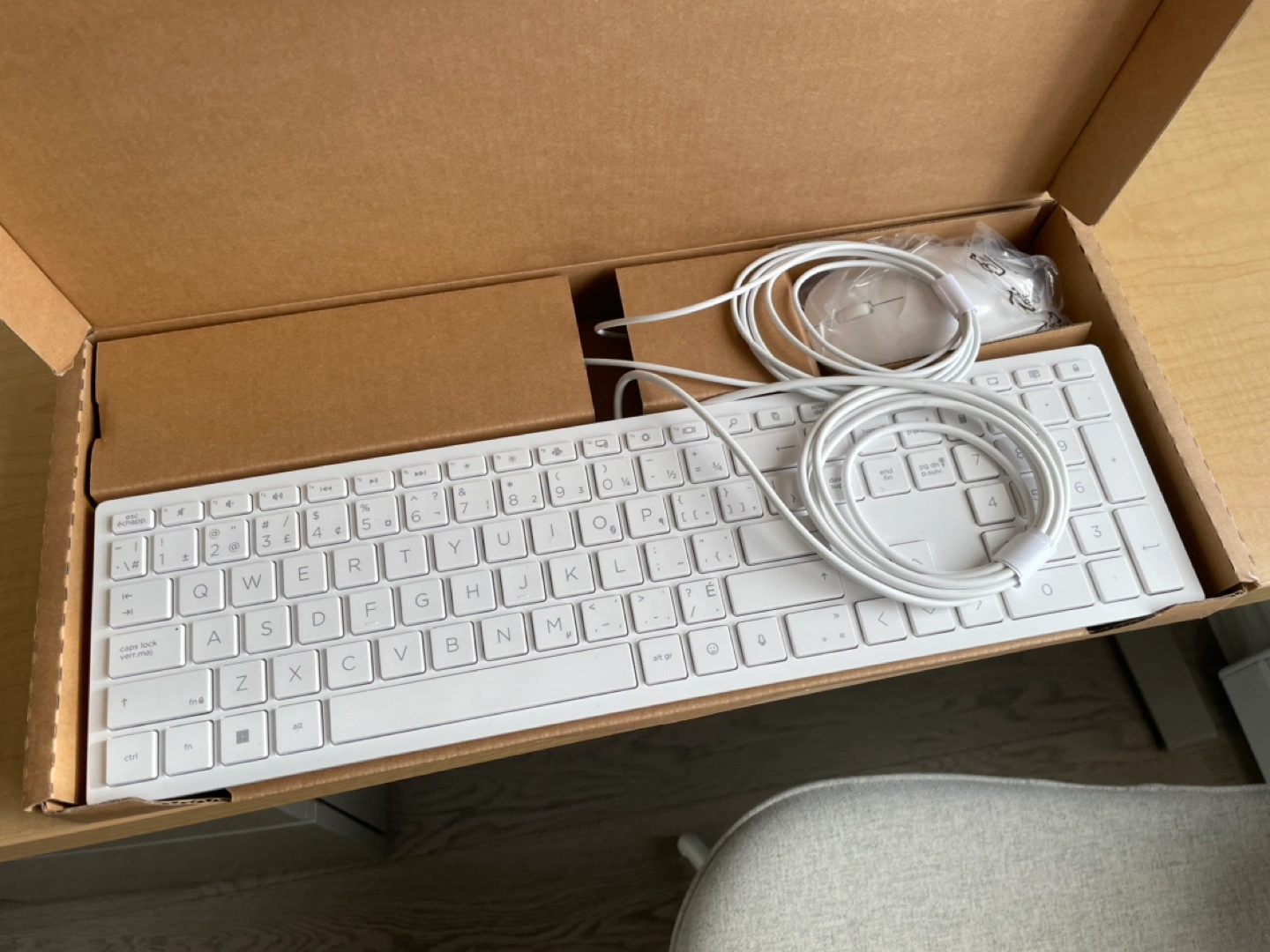 Compact wired keyboard and mouse. White colour. Includes cords. Pick up at 7488 Byrnepark walk Burnaby