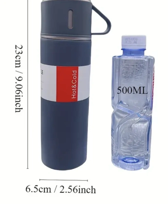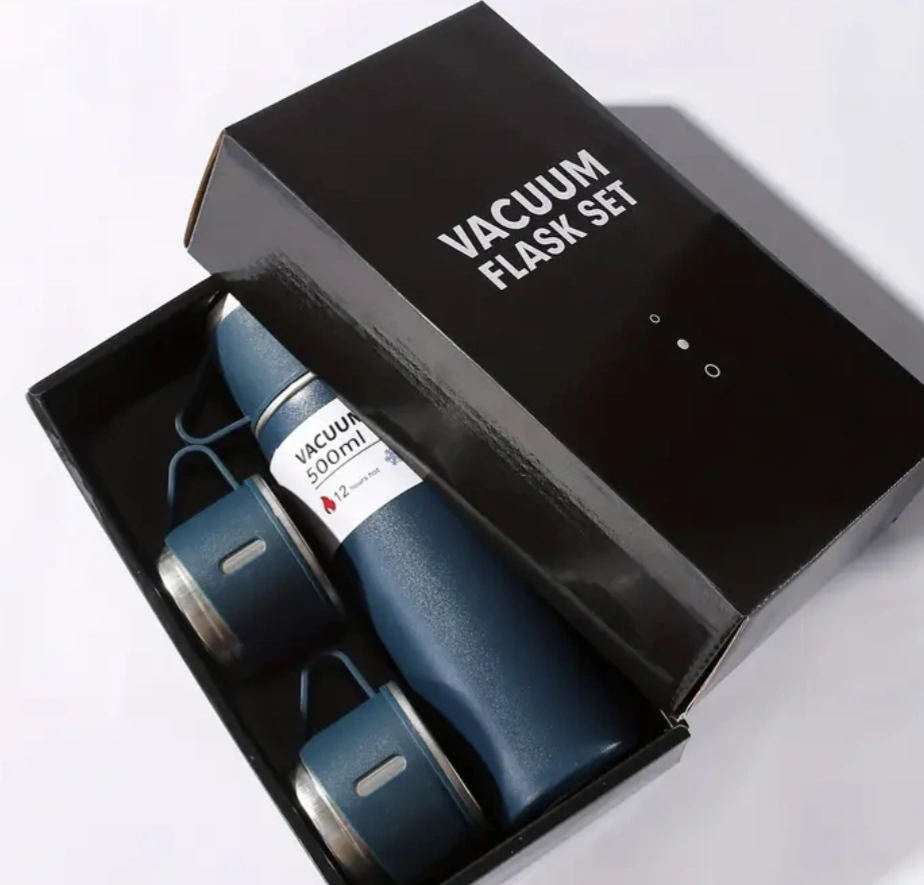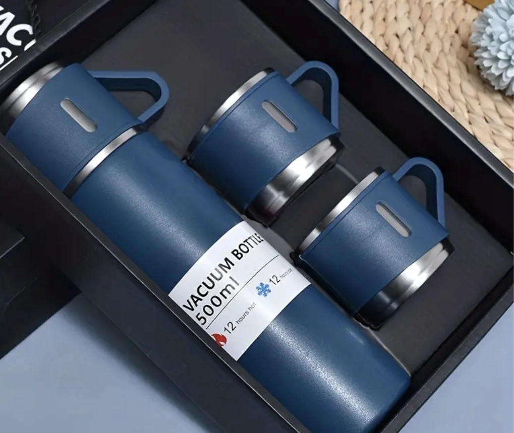 Stainless steel, portable vacuum flask set. In navy blue, Includes two small cups Top is also a cup holder and seal. Keeps drinks hot or cold. Great for travel or everyday use. 500ml capacity. Holds 500 ml of fluid ounces. Each small cup holds about 165 ml. ( Sells for over $35 else where ). I have one my self in black colour. I put homemade soup in mine. It is a durable , keeps my soup hot, amazing product! +++ Finally why buy from me rather than some one else.? I am verified, I am reputable. I am reliable. No one that has delt with me ever had a compliant. I earned 1000 Karrot Points status from Rookie status. And depending on where in the city you are I will deliver. +++ $10