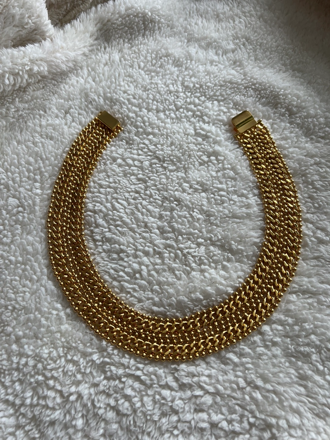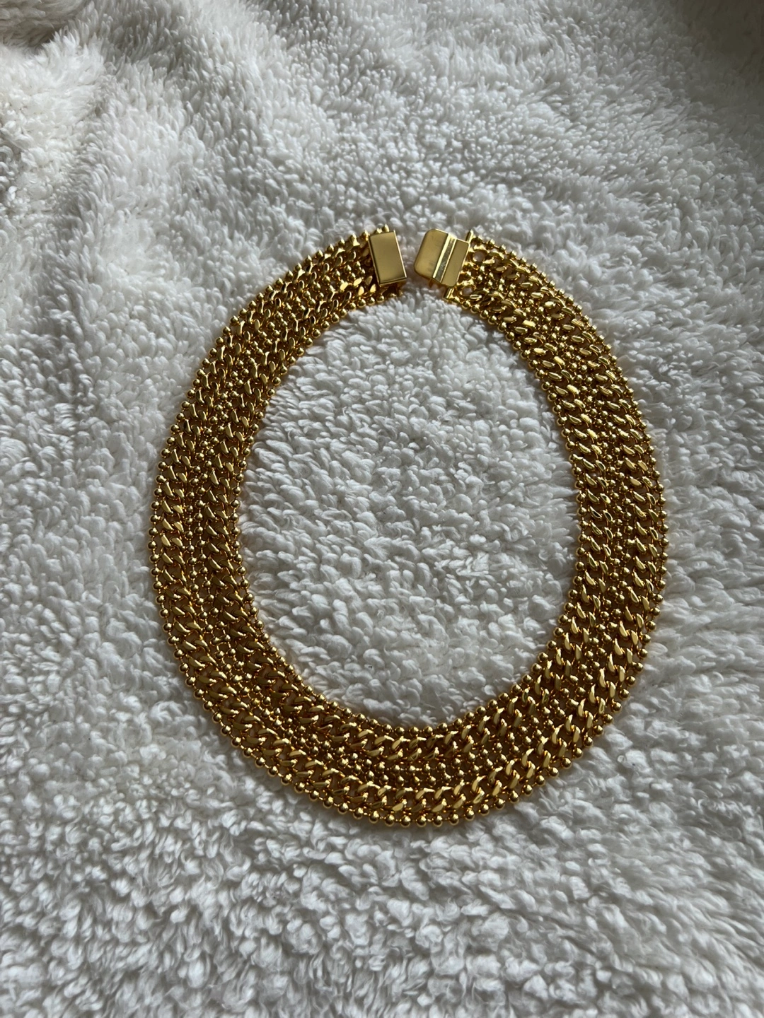Multi-layered gold tone necklace. Features a textured chain design. Classic style statement piece. Plated 14k gold.