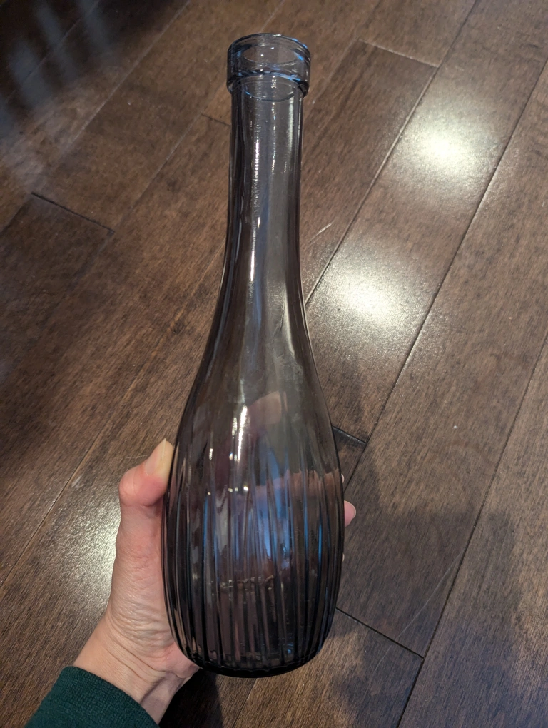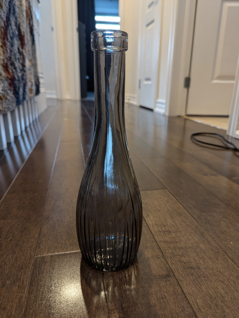 Elegant dark grey glass vase. Ribbed design. Perfect for home décor. Adds a touch of sophistication.
