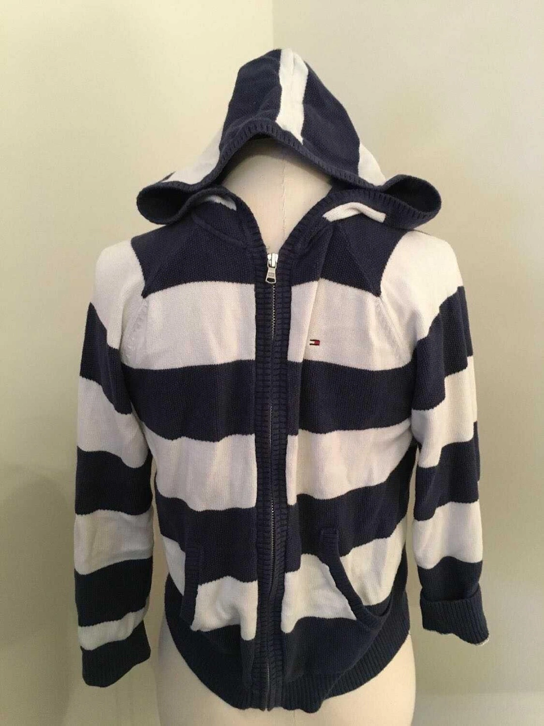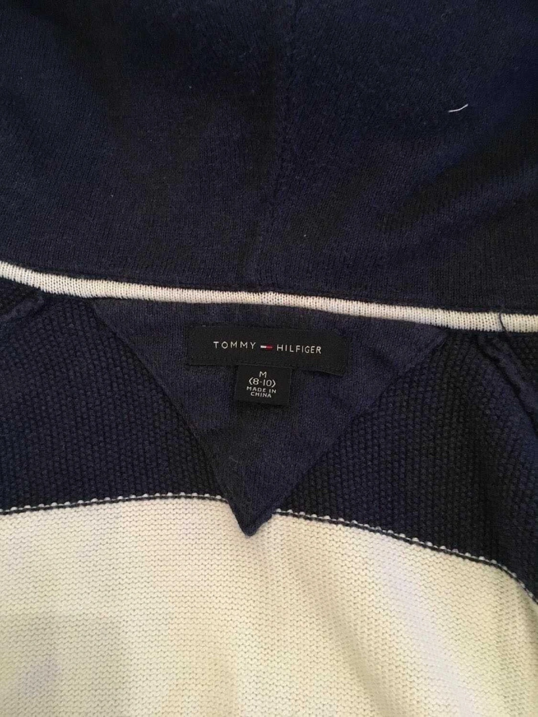 Tommy Hilfiger, Navy and white striped hooded sweater. Zip-up front. Long sleeves. Kids Size Medium (8-10).