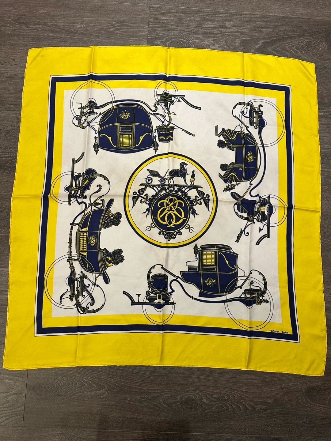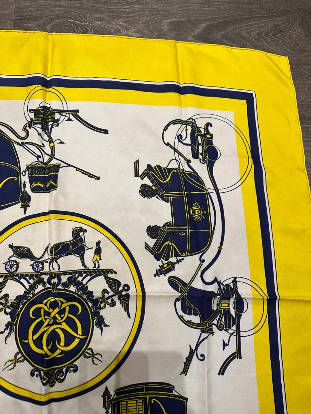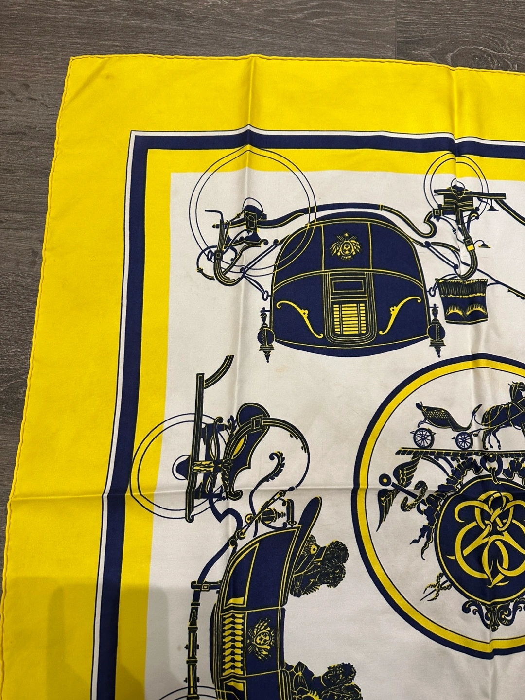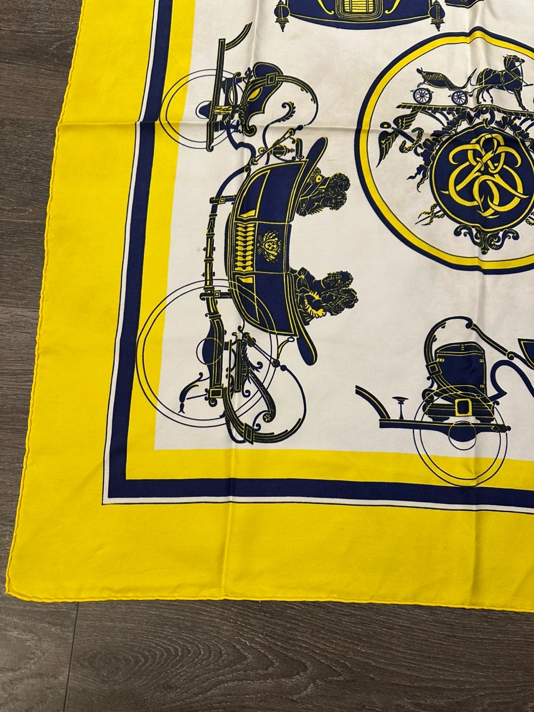 100% Authentic Hermes Scarf Silk Ex Libris Yellow Vintage rare 88 cm x 86 cm Good pre-owned condition - imperfections are shown in Photos Please check all photos and ask questions