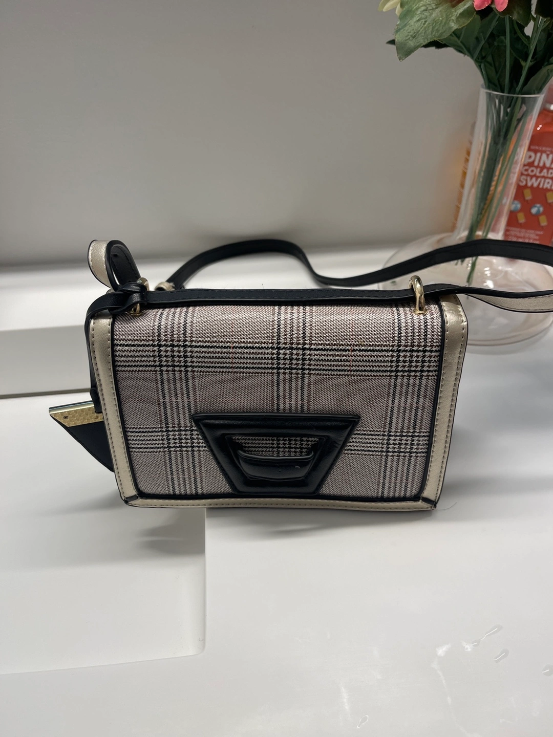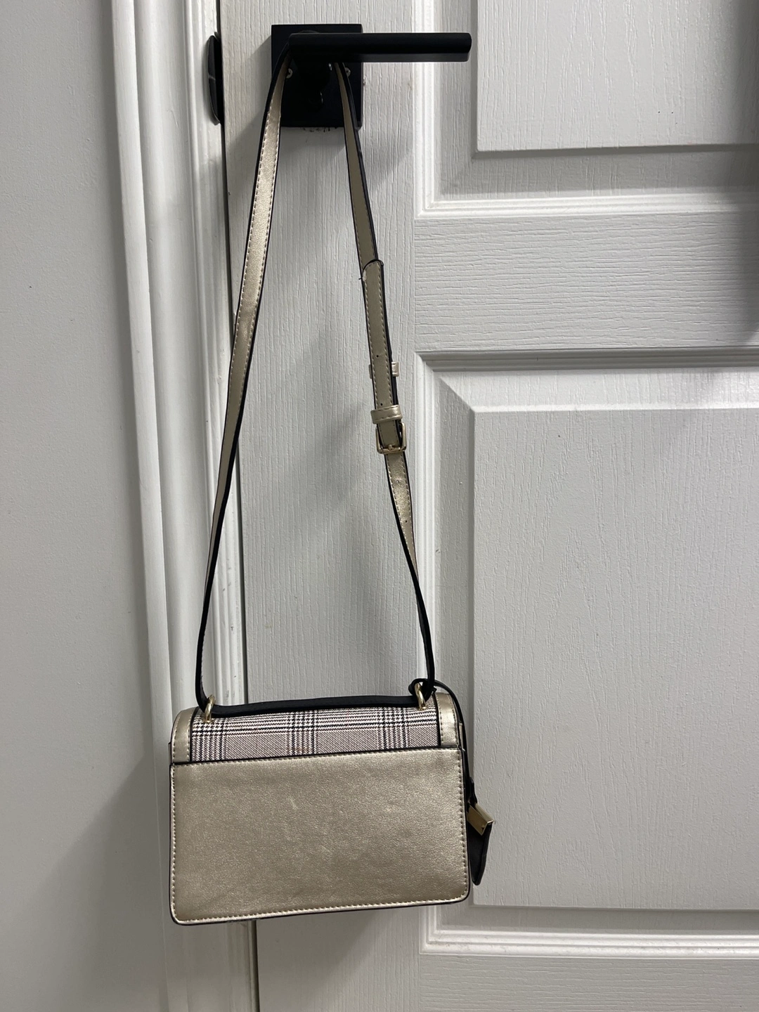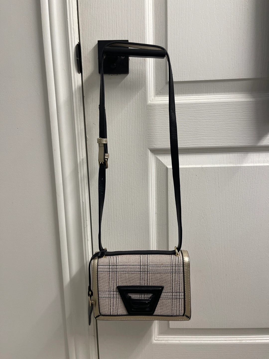 Small crossbody bag. Features gold accents and a plaid pattern. Adjustable strap. Perfect for everyday use.