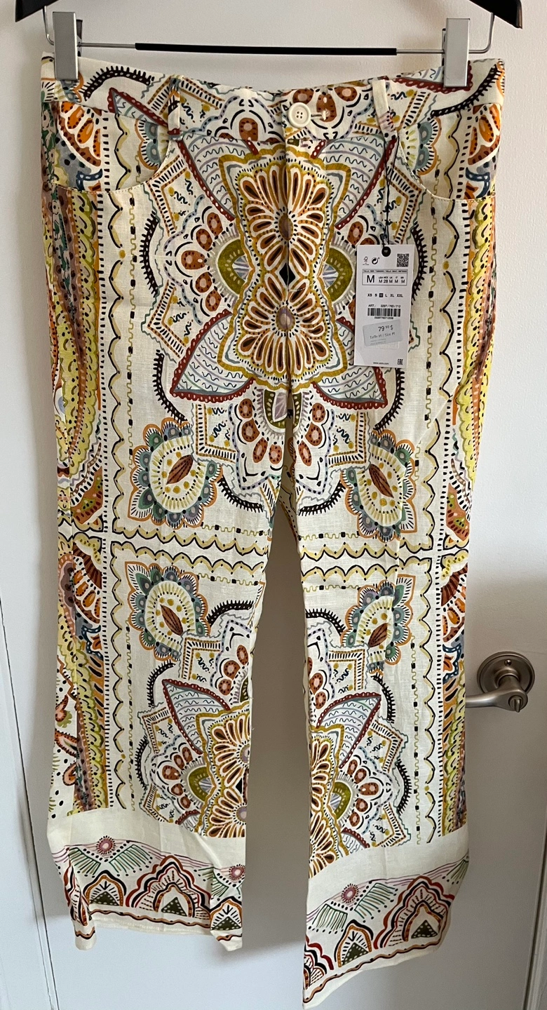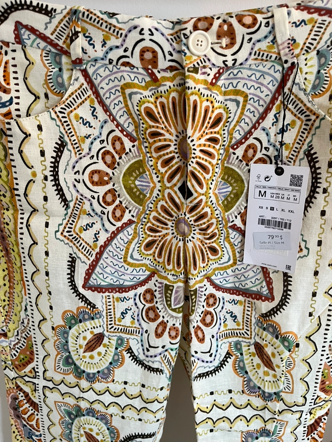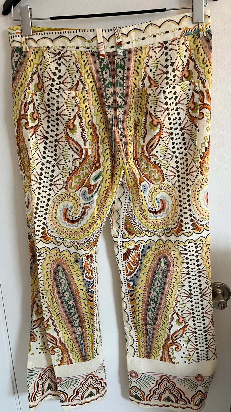 Brand new with tags. Wide-leg trousers. Size medium. Paisley print. Cream coloured base. Multicoloured pattern.