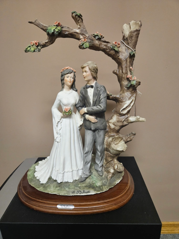 Beautiful porcelain figurine made in Italy. Wedding couple under a flowering tree. Comes with certificate of origin. A.J. Belcari signature. Elegant and detailed craftsmanship. Perfect wedding gift or home decor. Asking $40.⁰⁰. Ph. 204-612-7831