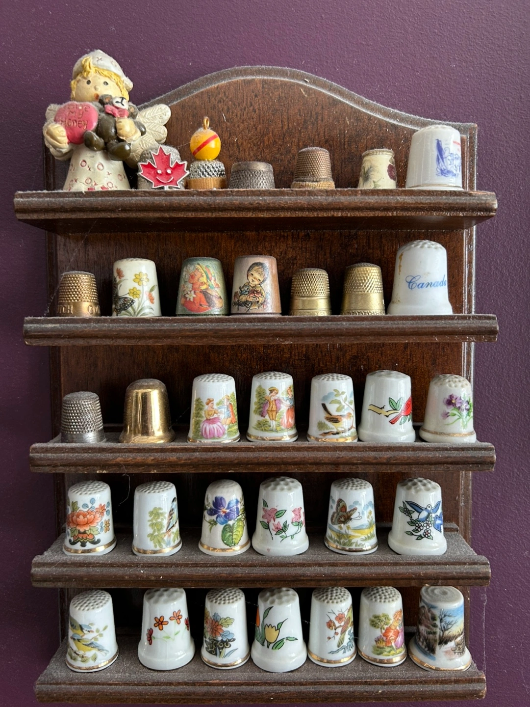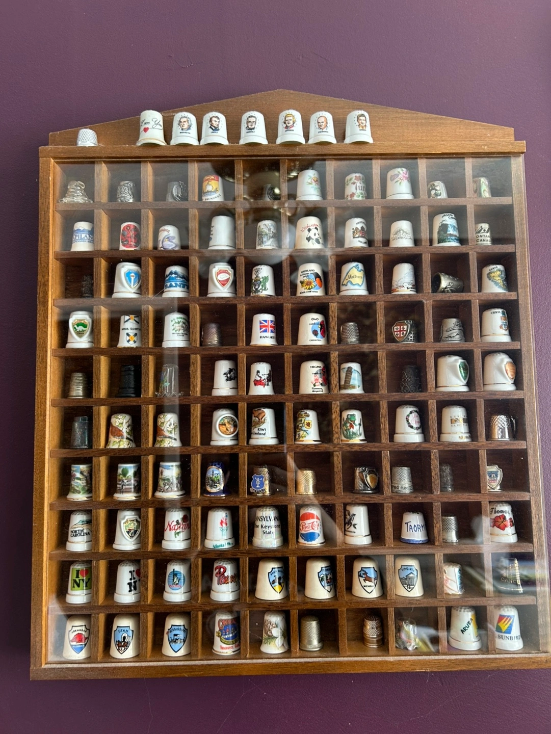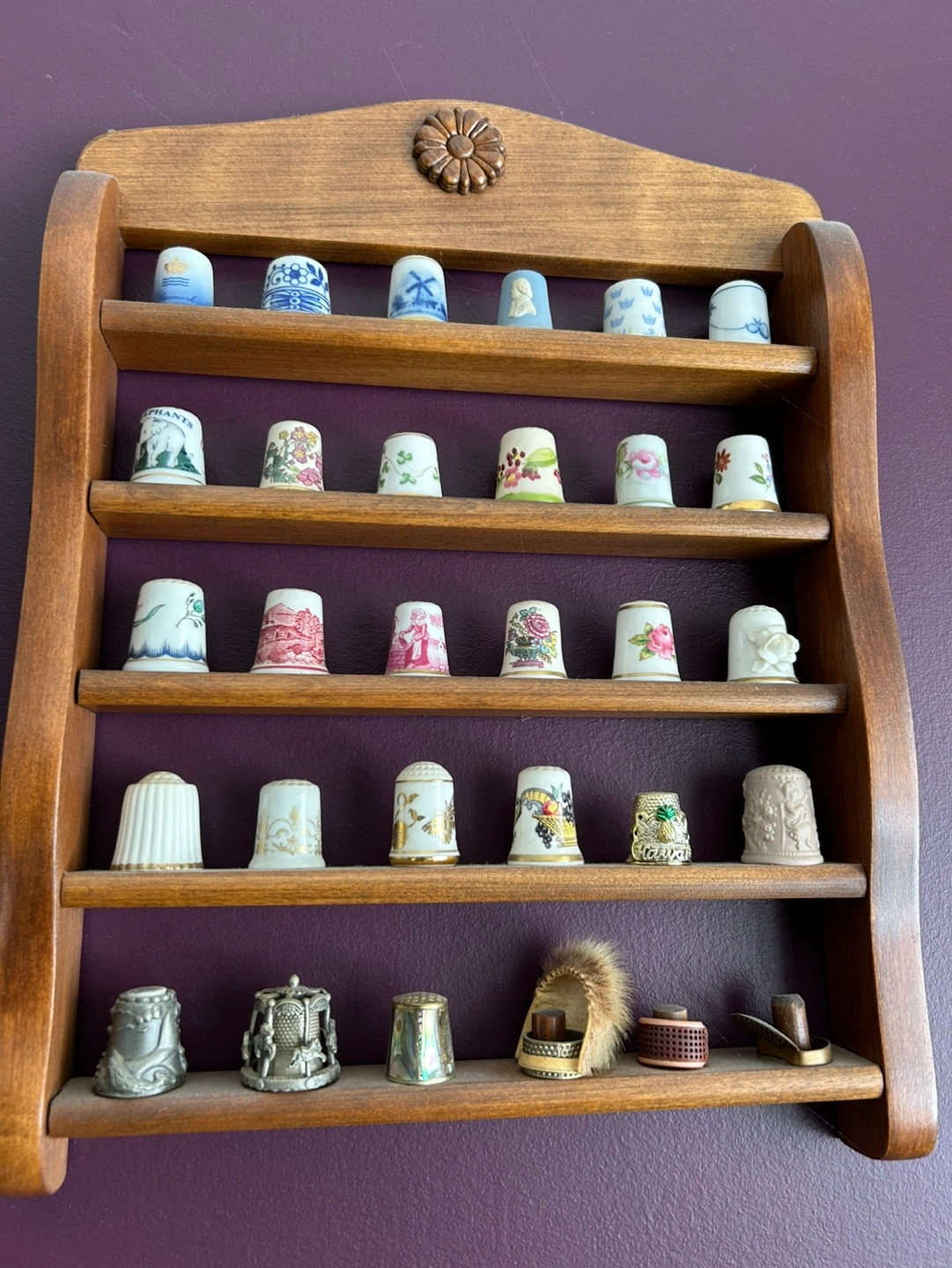 Several wooden thimble display cases. Many thimbles included, various designs and materials. Great for collectors.