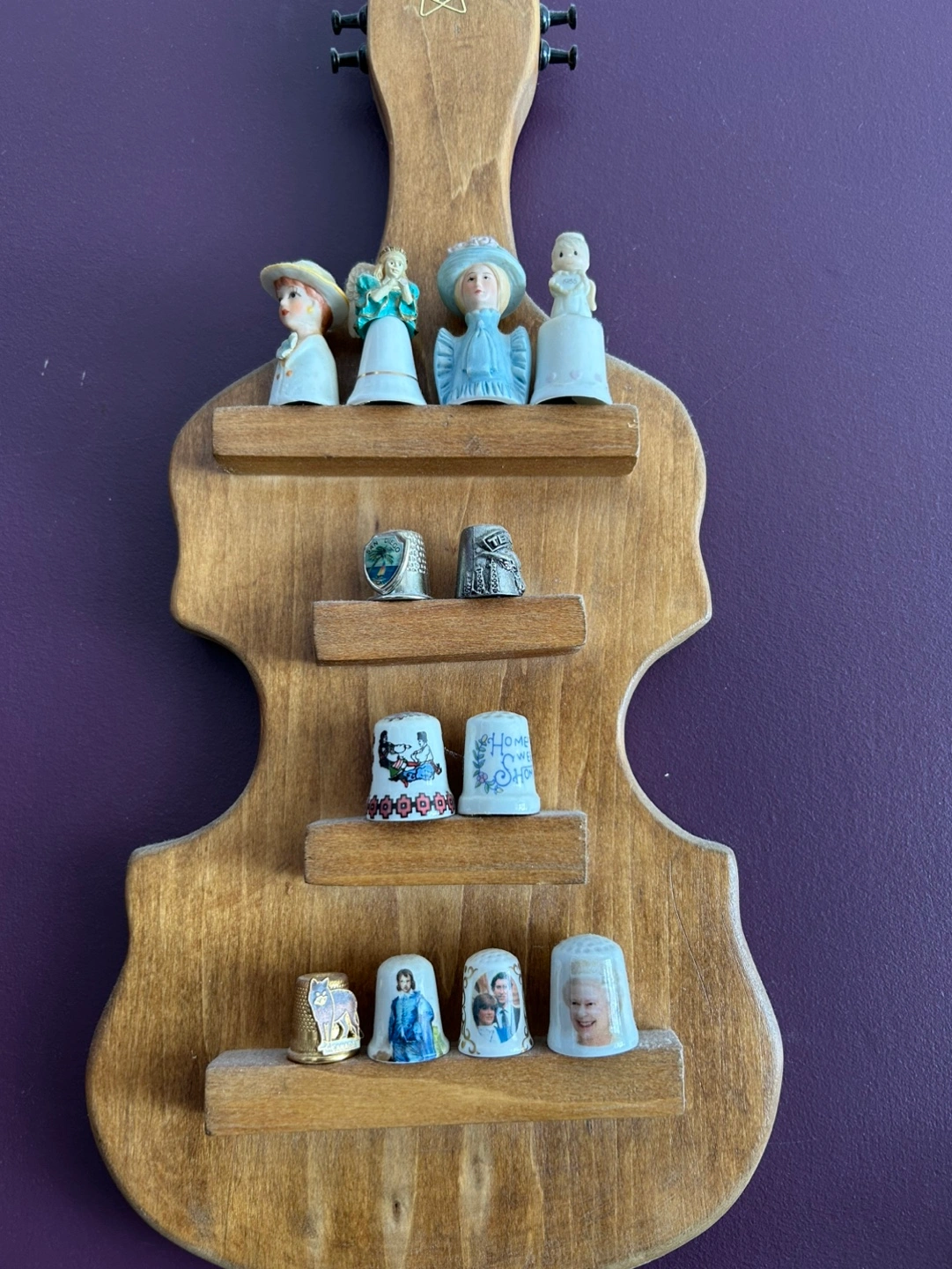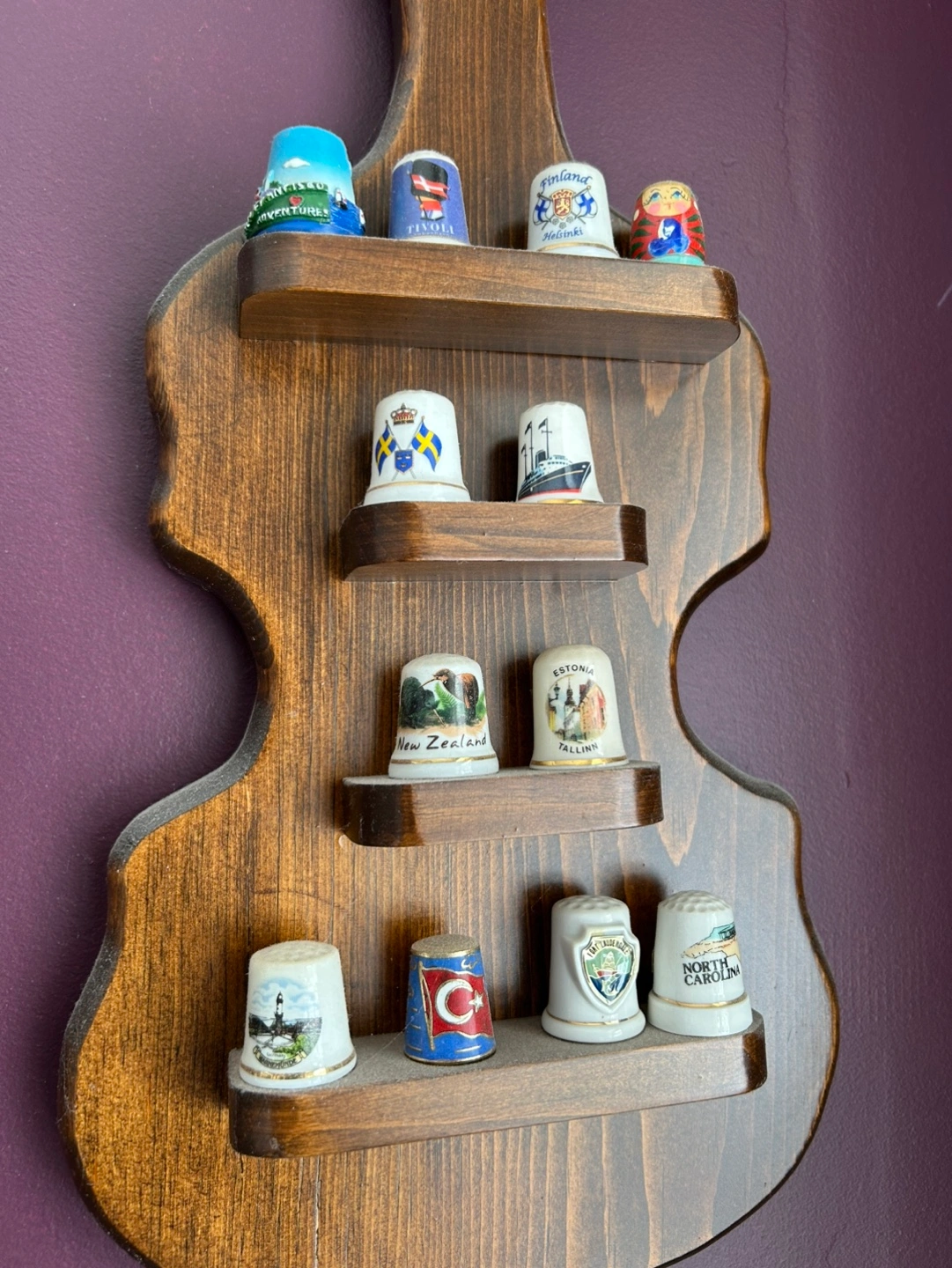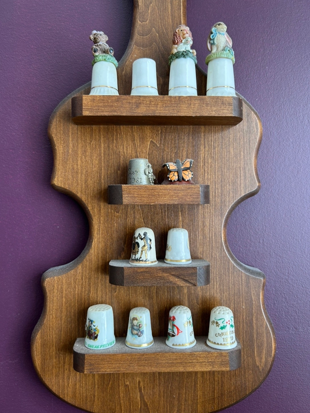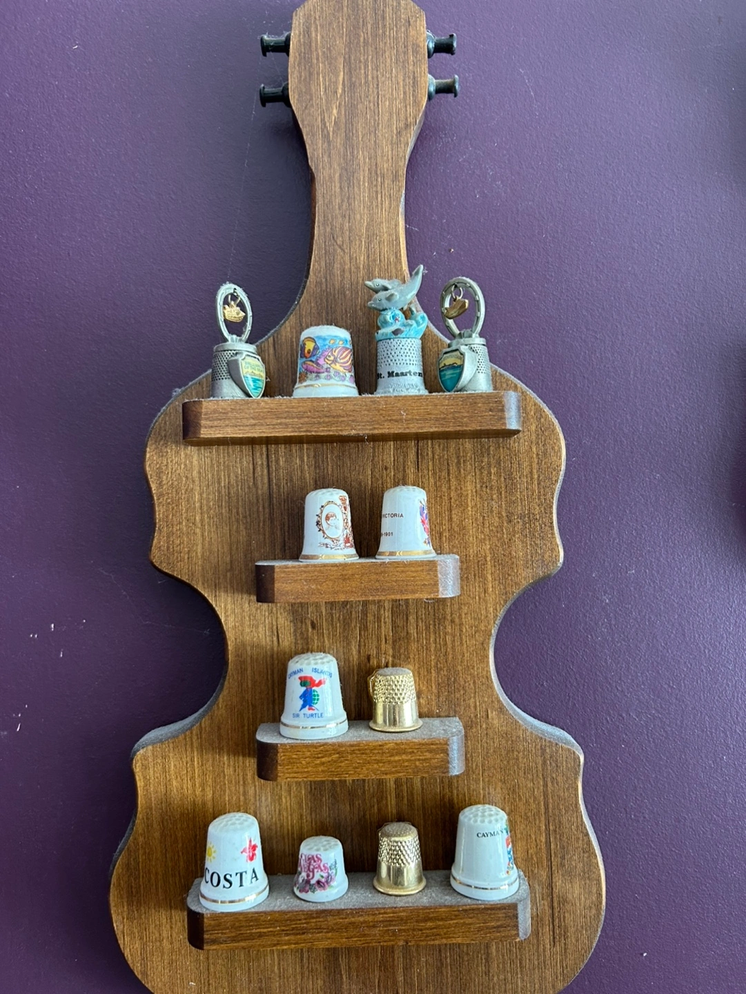 Several wooden thimble display cases. Many thimbles included, various designs and materials. Great for collectors.