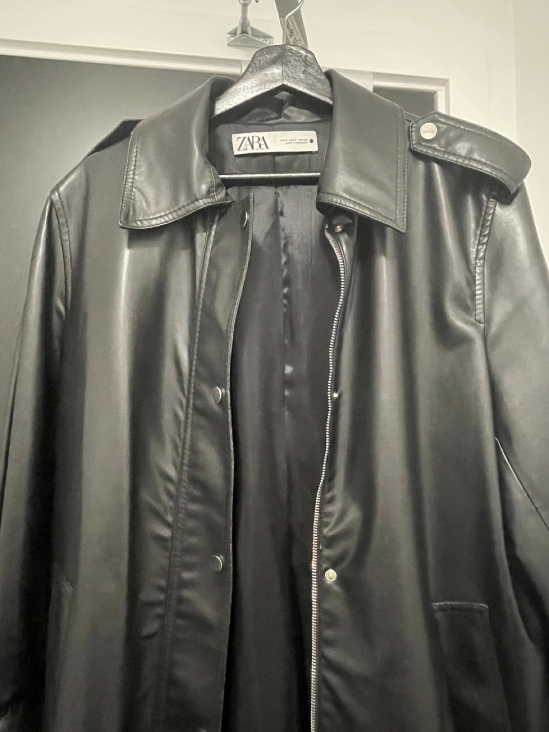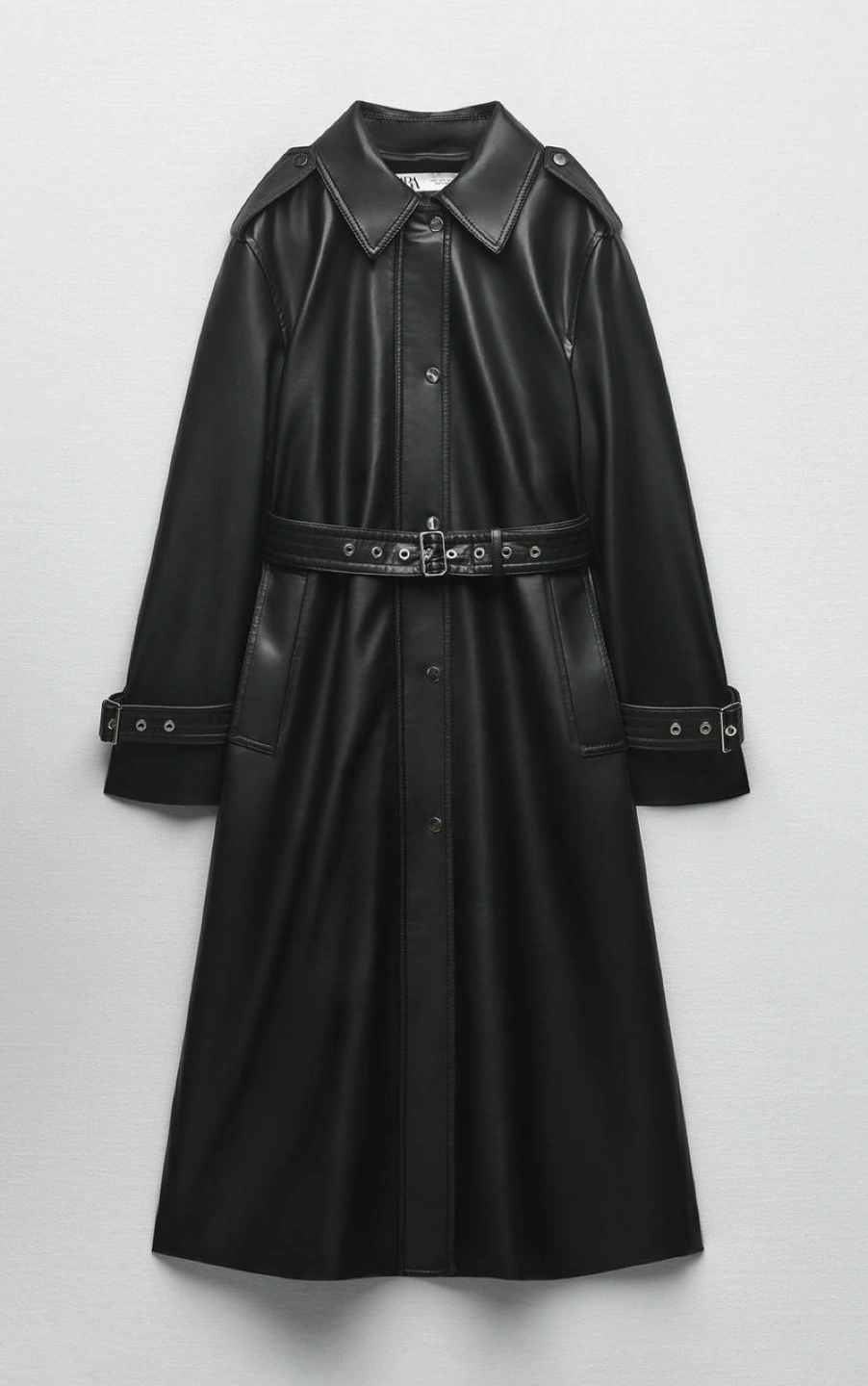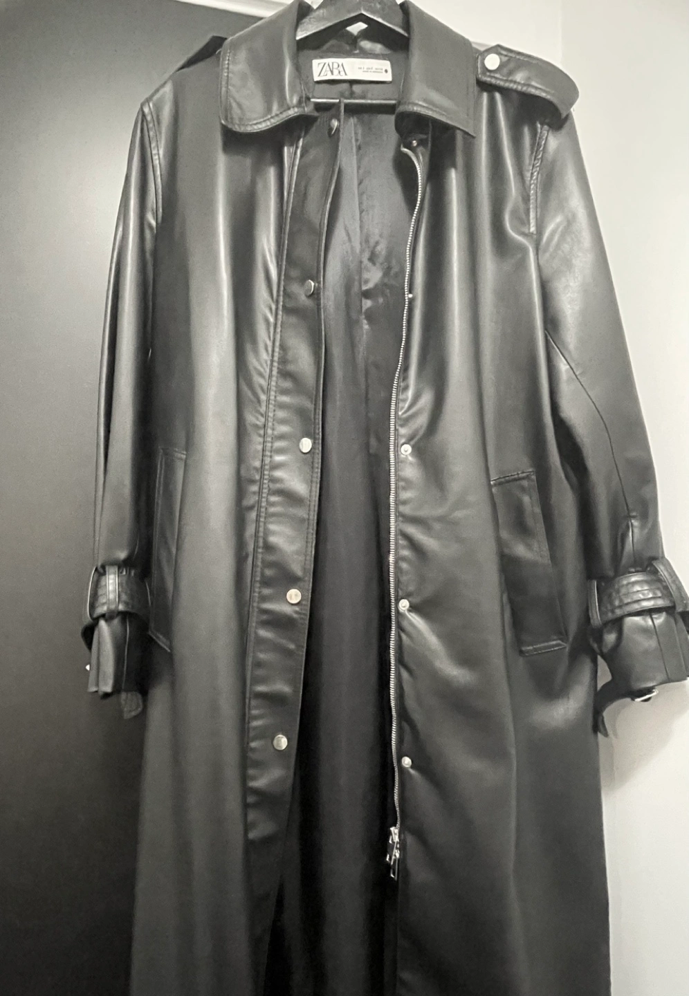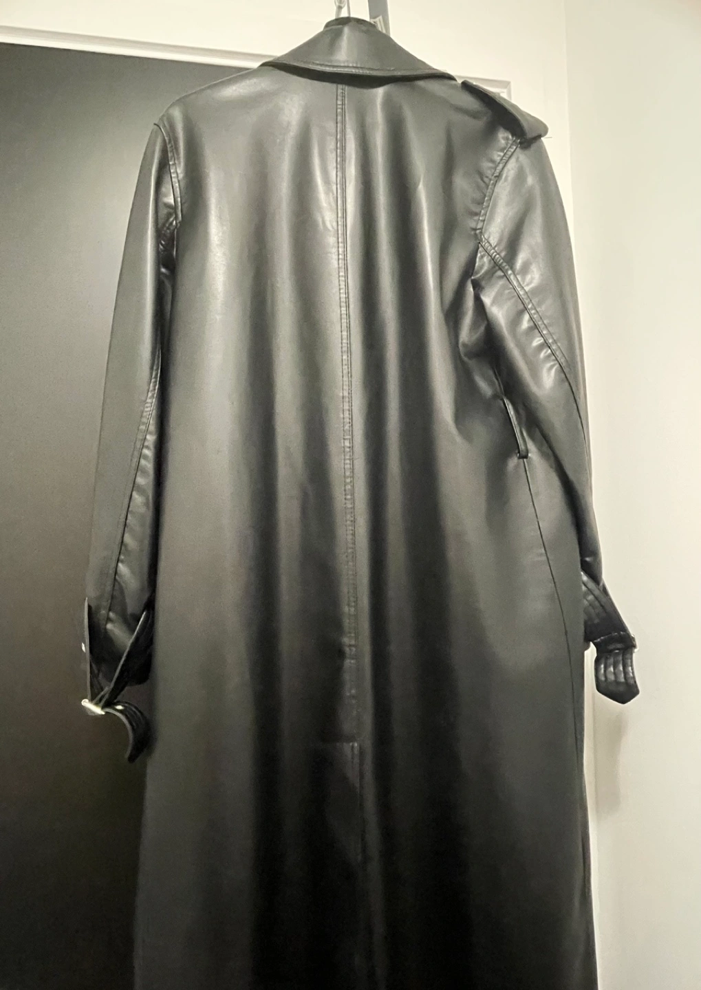 Long black faux leather trench coat. Features a belted waist and button closure. Has long sleeves with buckle details at the cuffs. Classic style, perfect for fall.
