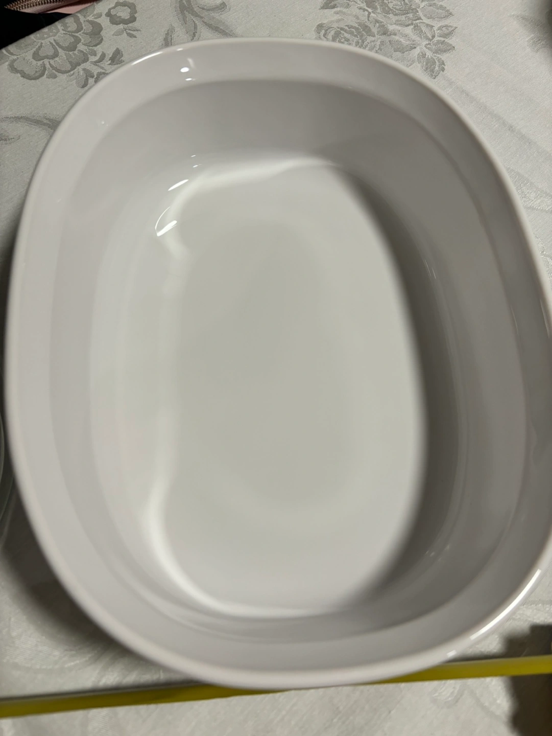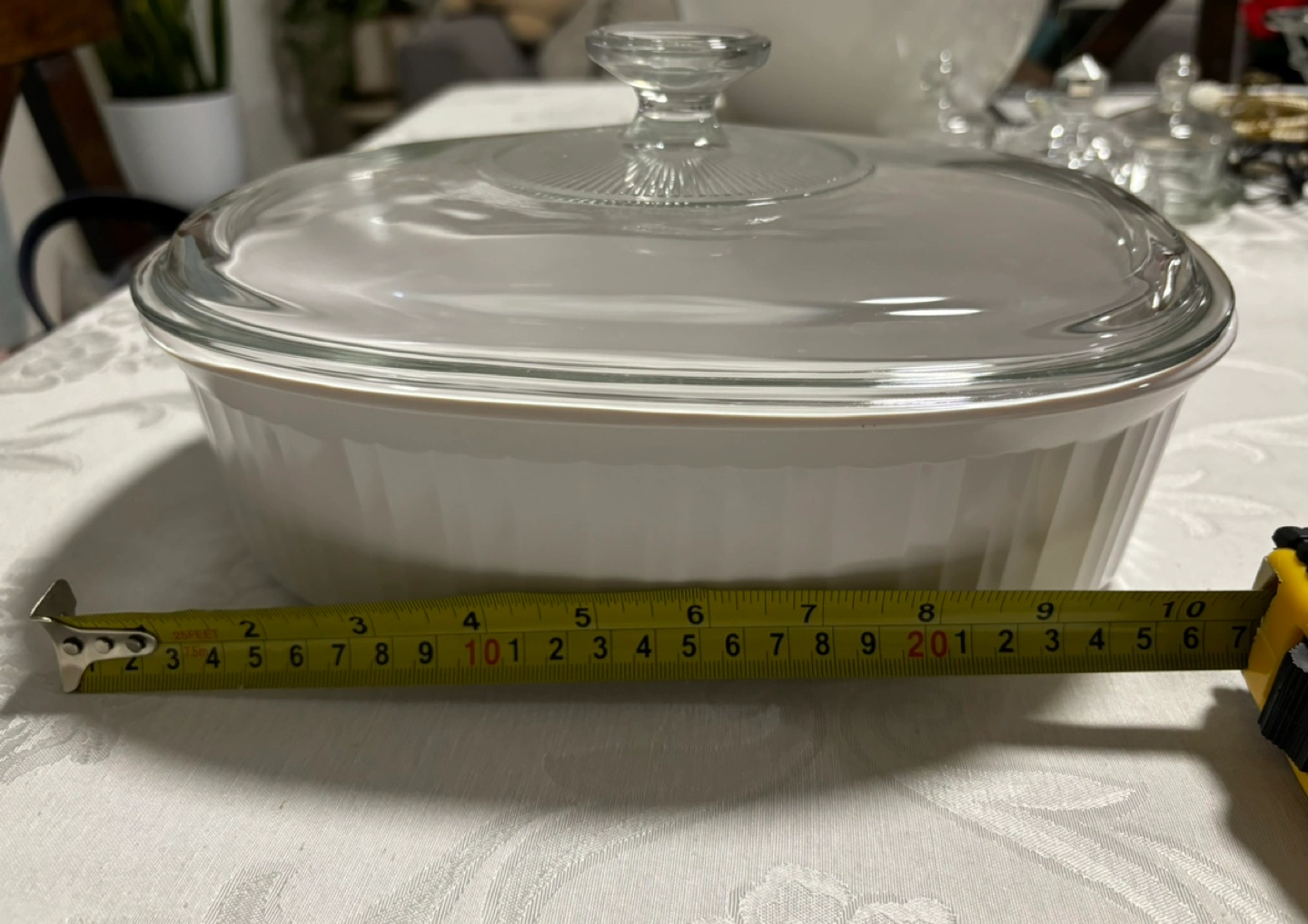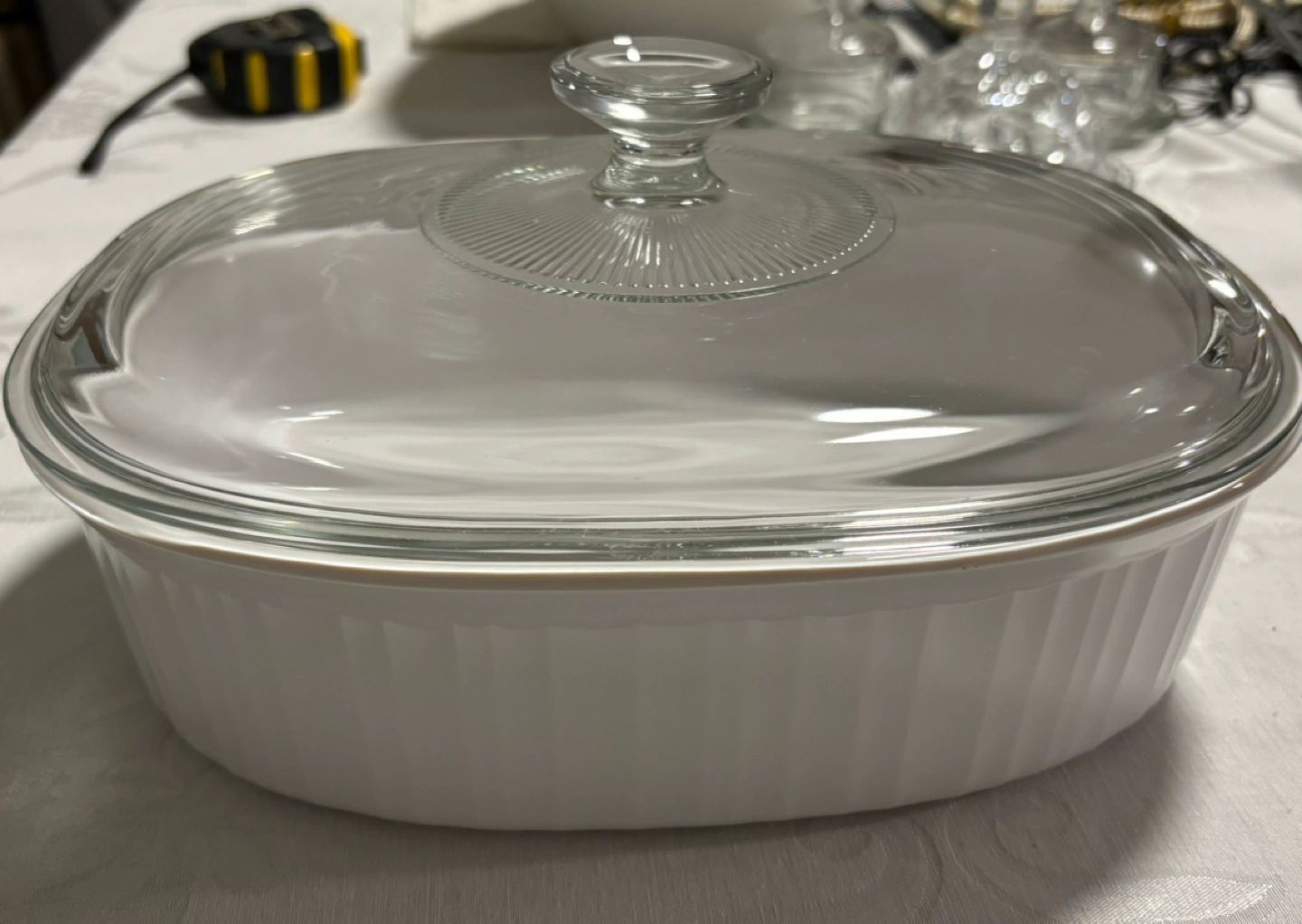 White oval casserole dish. Glass lid. 2.8 liter capacity. Excellent for baking and serving.