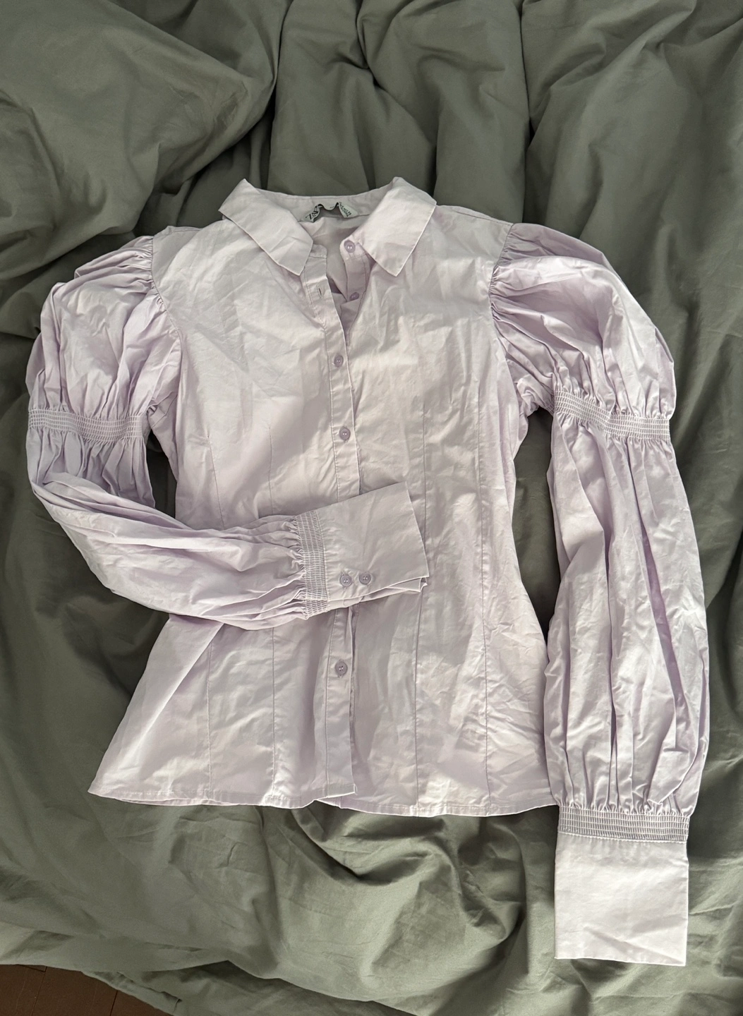 Lightweight lavender blouse. Features long puff sleeves and a collared button-up front. Beautiful design! Just took off the tags and never Worn. Buy three items from my listings and get one under 10 for free! Multiple purchases come with decent discounts!