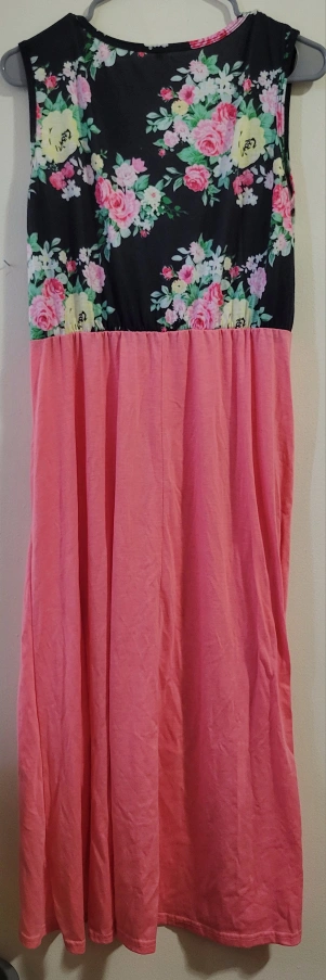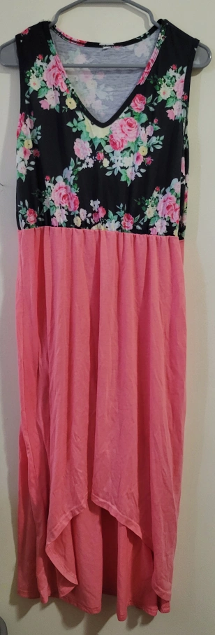 Women's maternity sleeveless maxi dress. Features a black floral bodice and a coral-coloured skirt. High-low hemline. V-neck. ************************************************* **PICK UP ONLY**
