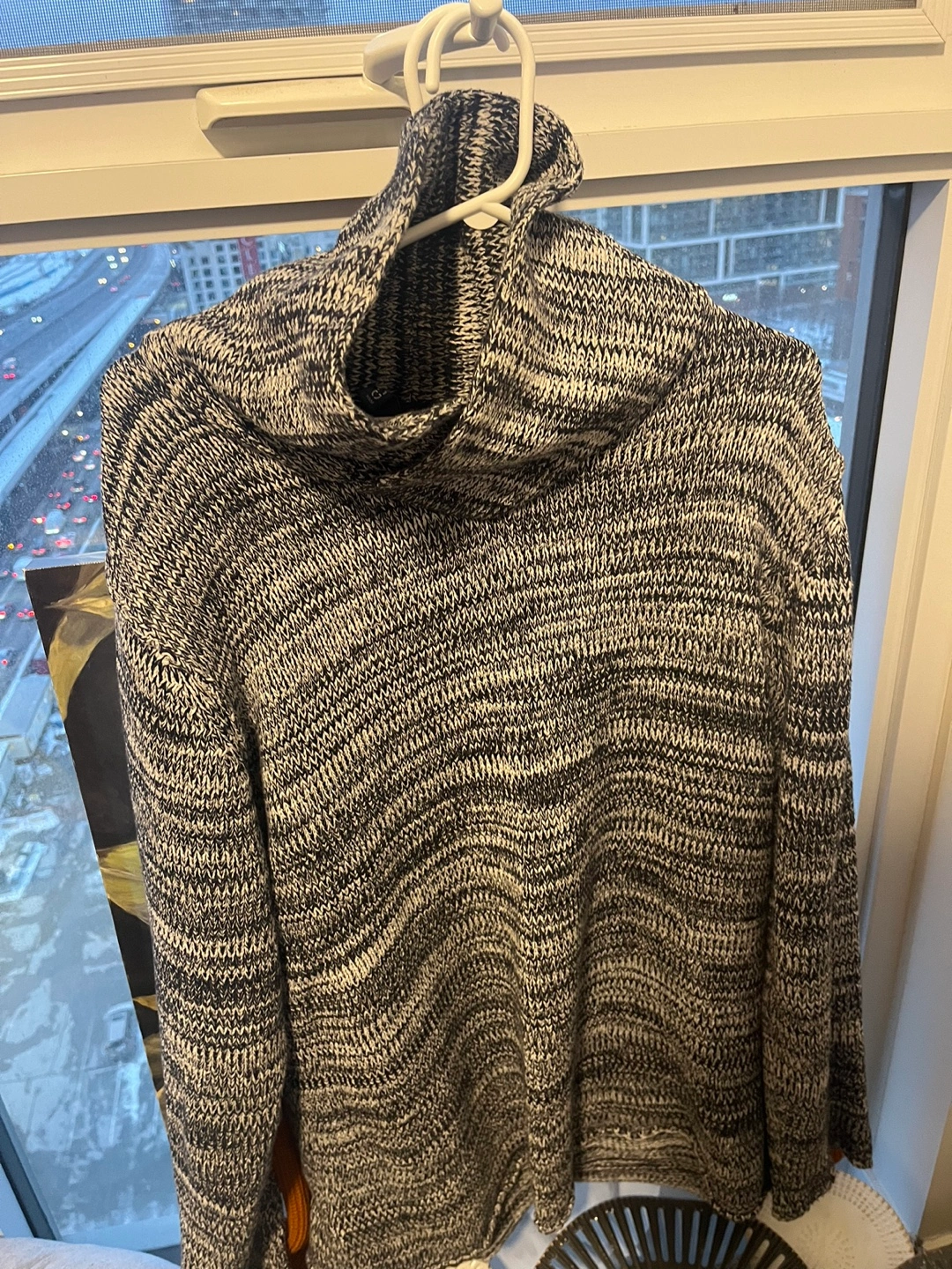 Cozy mock neck sweater. Black and white speckled pattern. Long sleeves. Relaxed fit. Great for fall and winter.