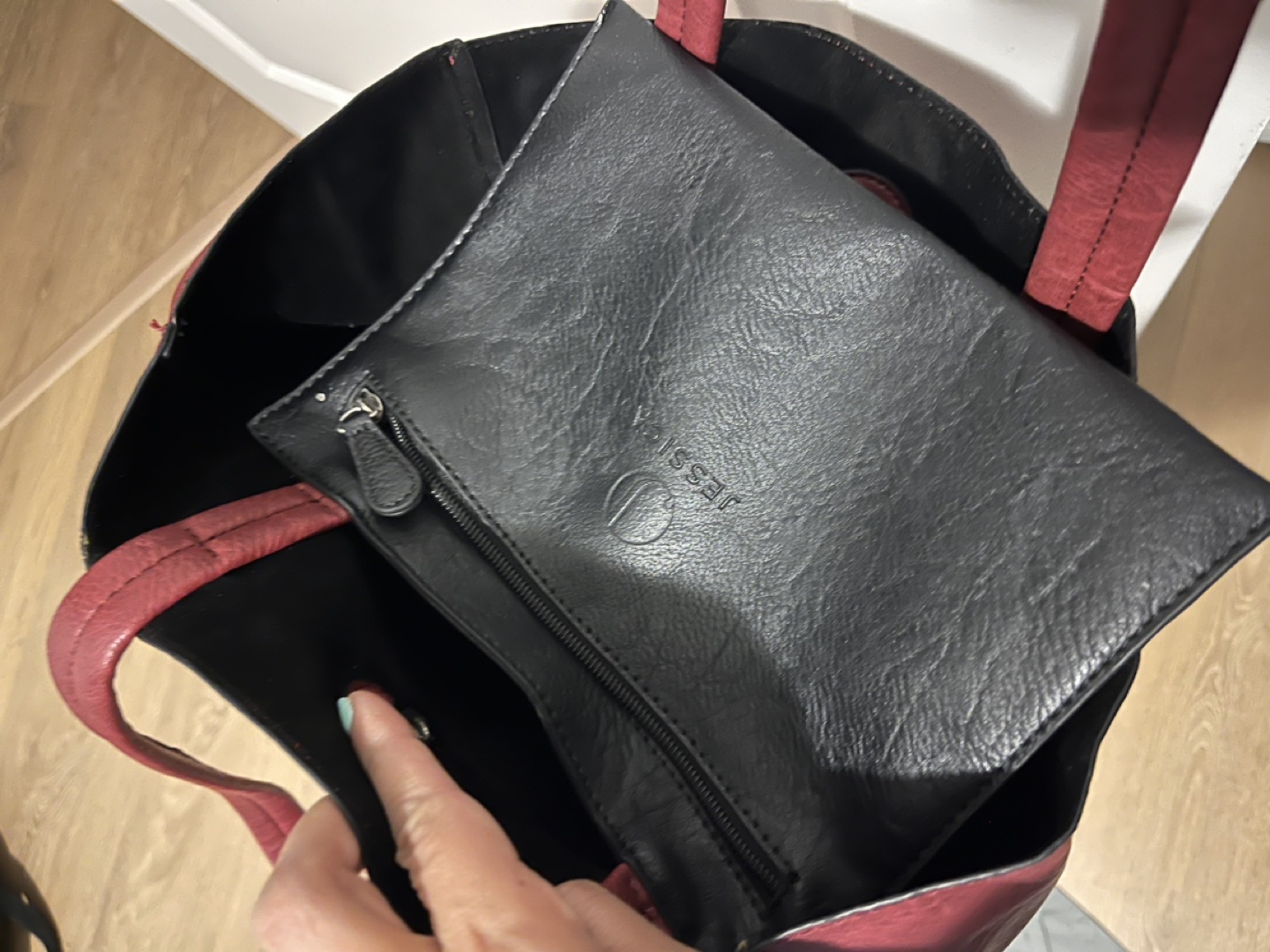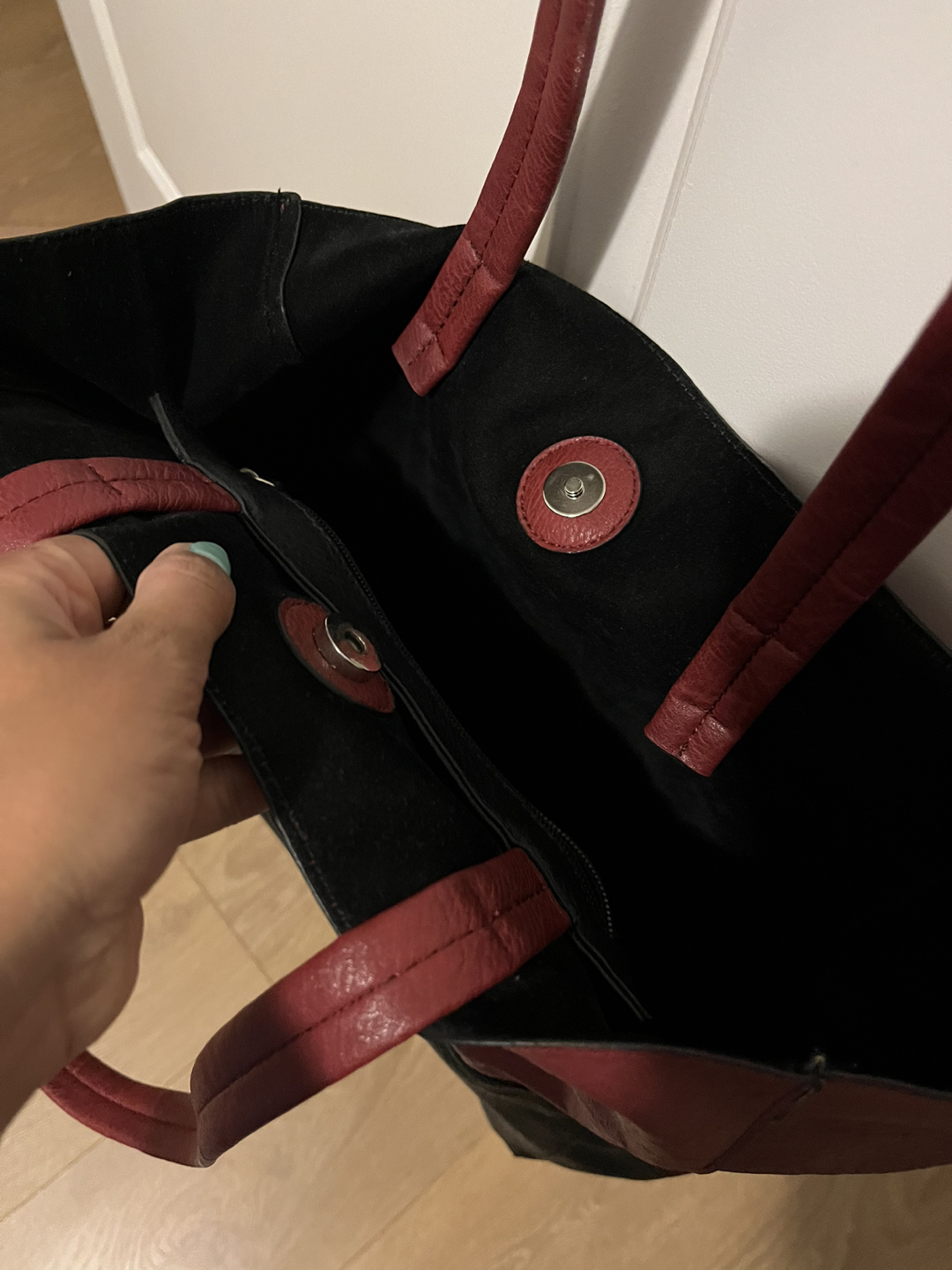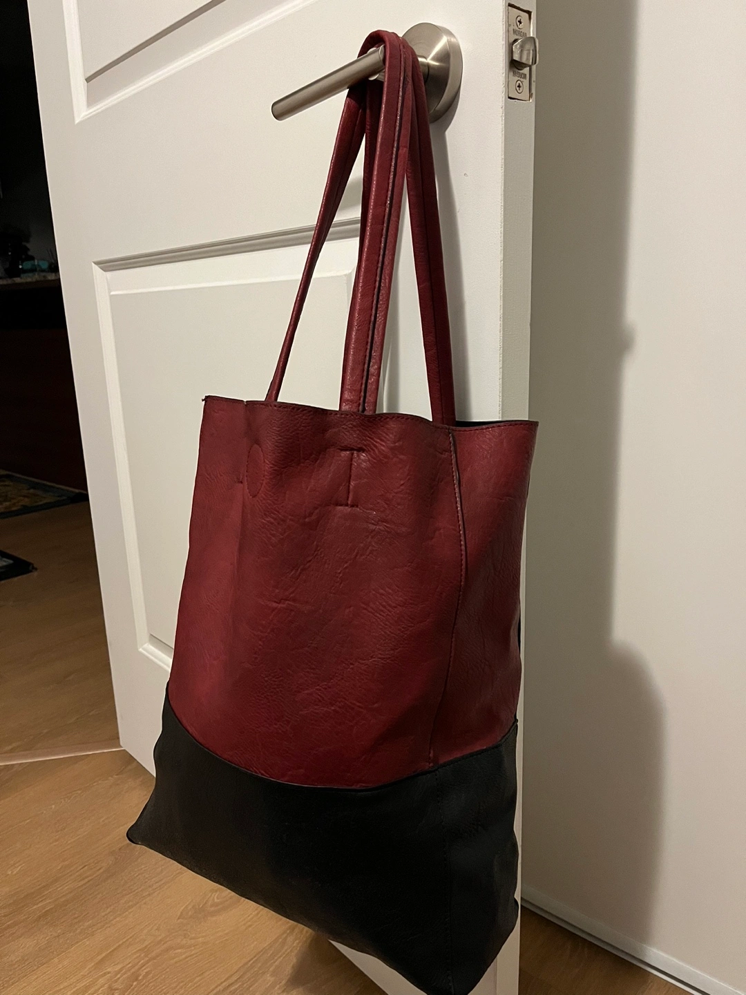 Material is pleather on the outside and felt on the inside. Includes attached mini purse holder inside. Magnet button for closure of the tote bag.