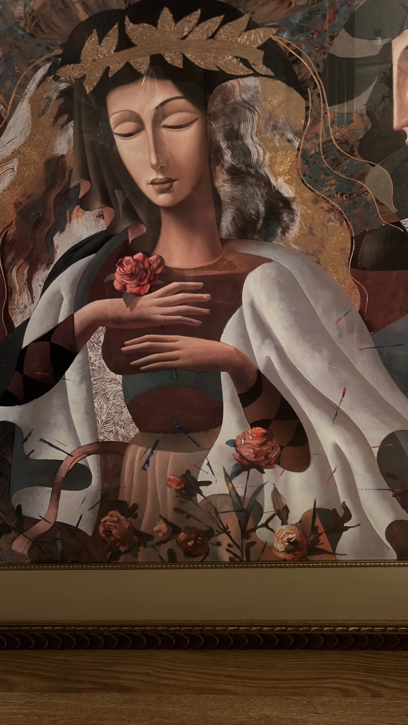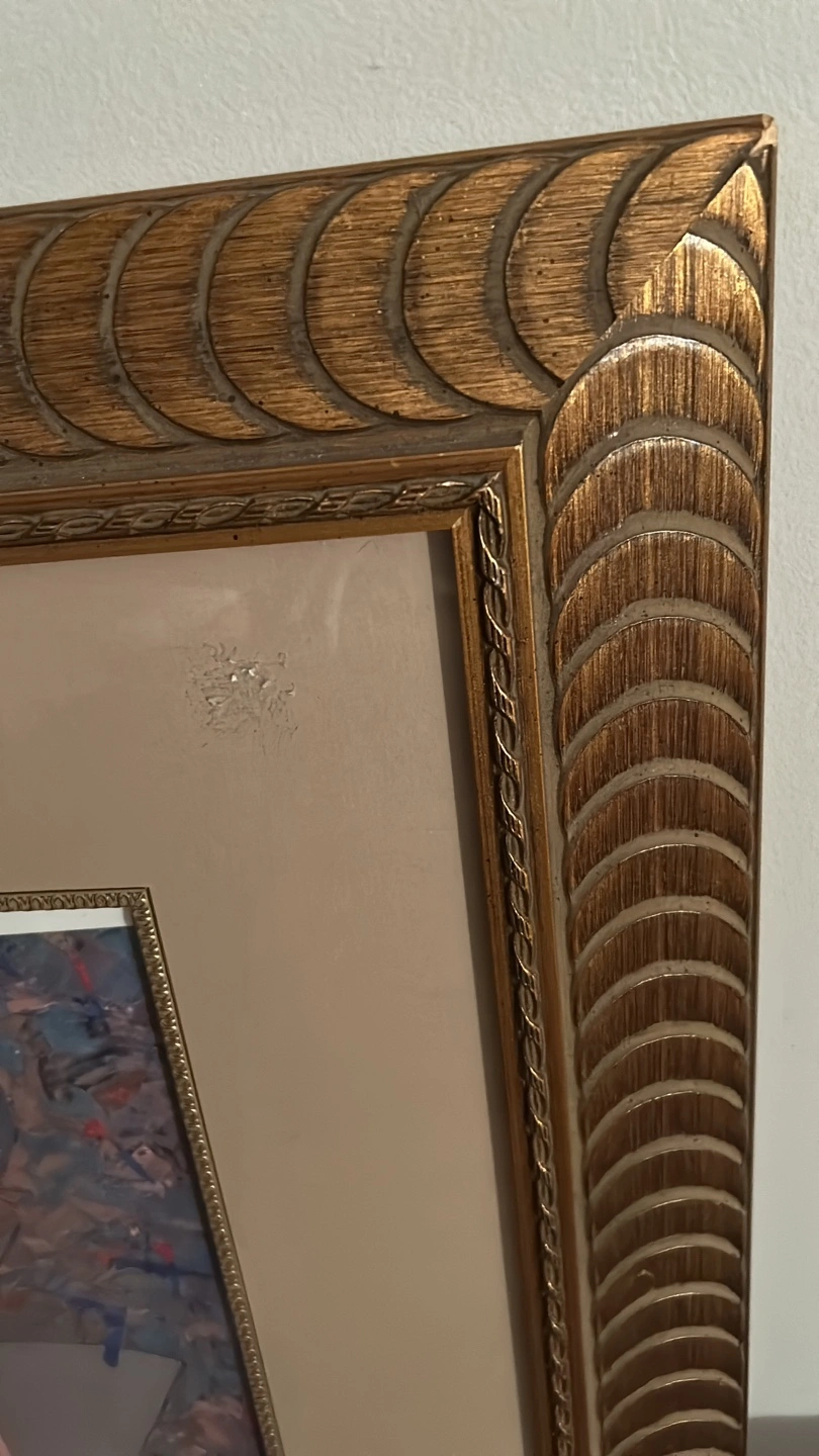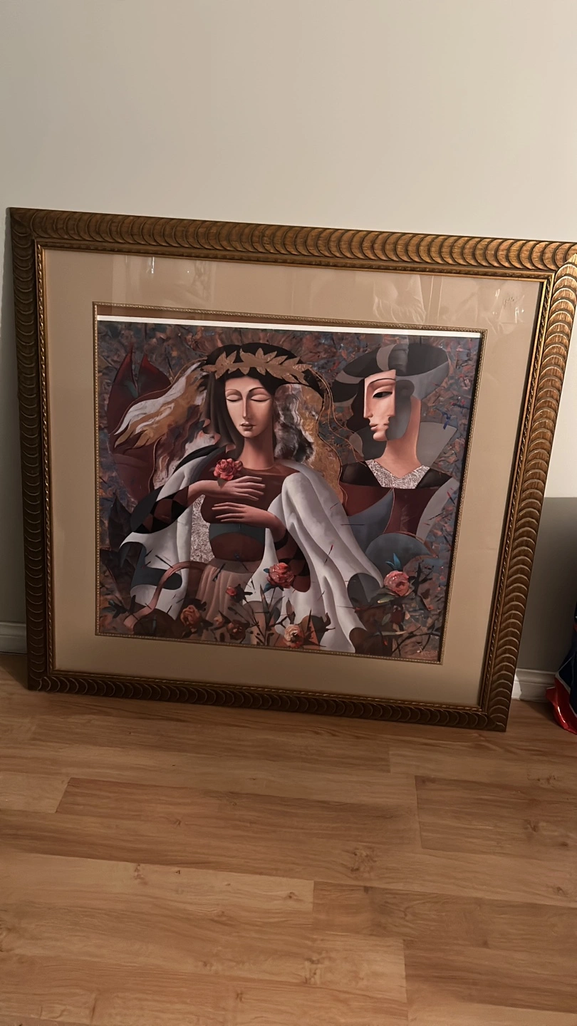 Large framed art print featuring two figures. Gold ornate frame. Beautiful colours and detail. Suitable for a large wall.