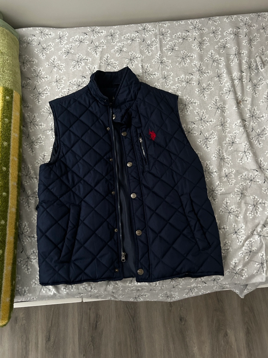 Men's navy blue quilted vest. Features a zipper and button closure. Has pockets.