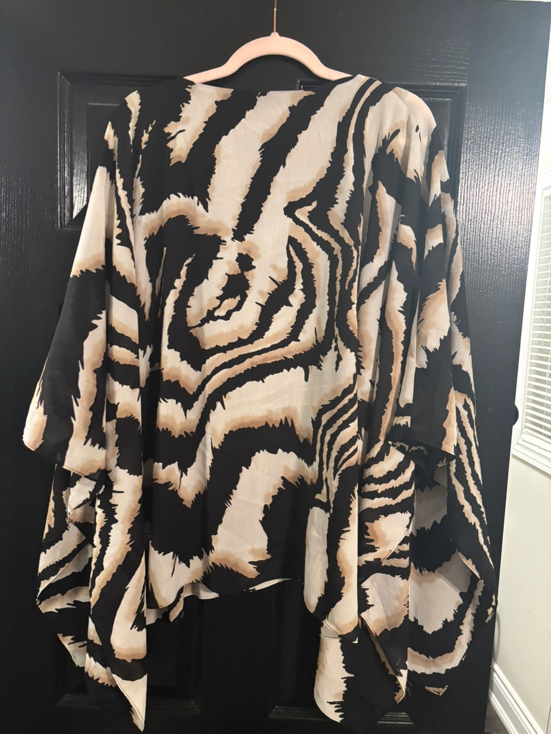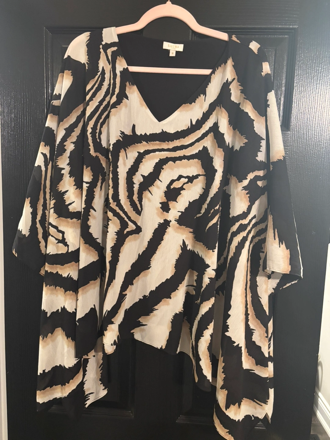 Lightweight poncho. Black, beige, and white abstract print. V-neck. Flowy and comfortable. Size 18