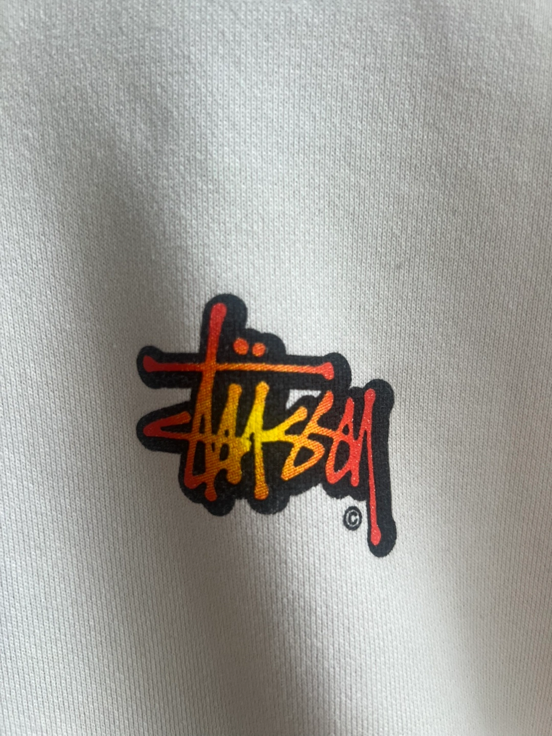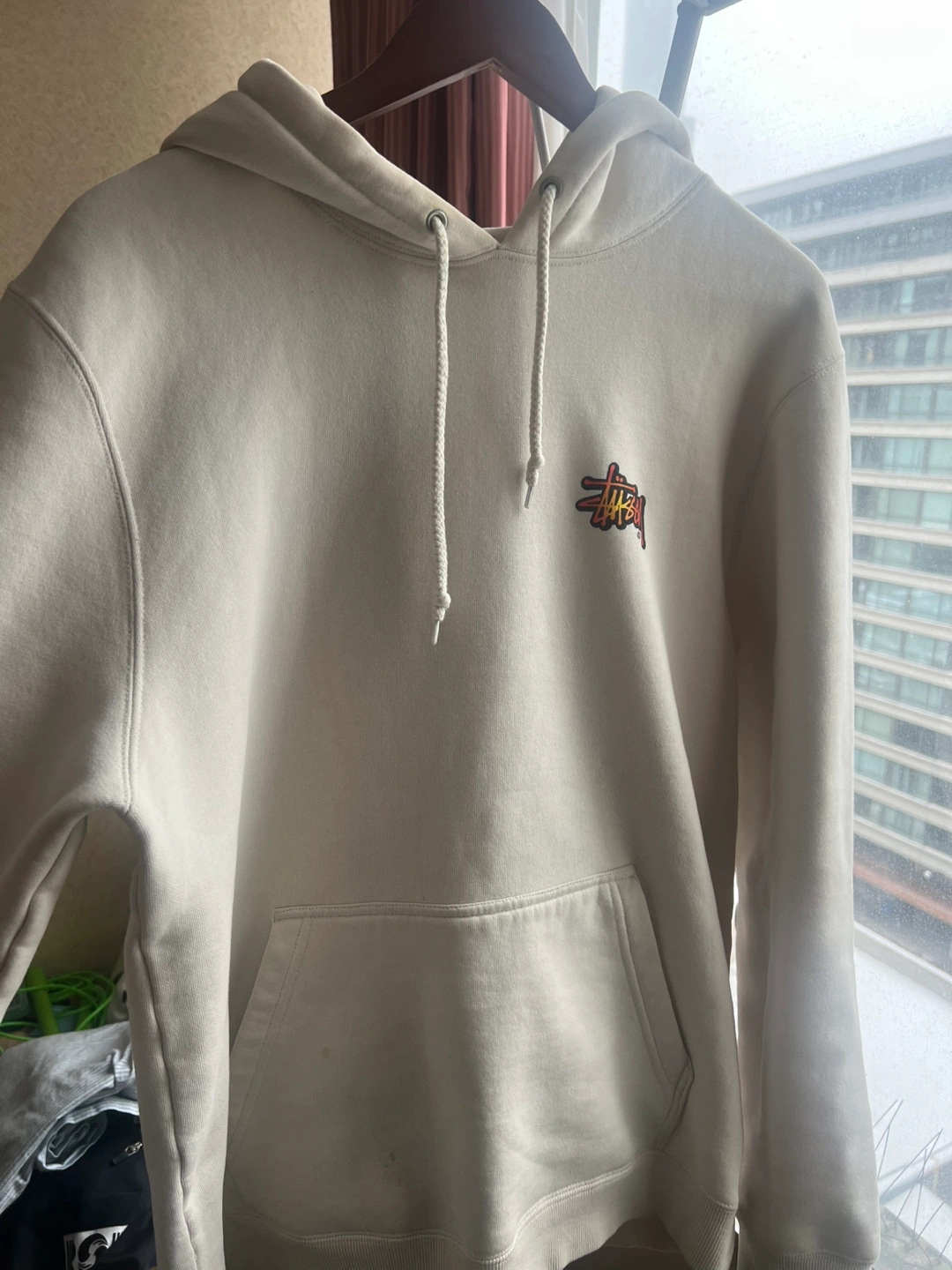 Cream coloured hoodie. Features a flaming 8-ball design on the back. Small Stüssy logo on the front. Minor damage visible in image.