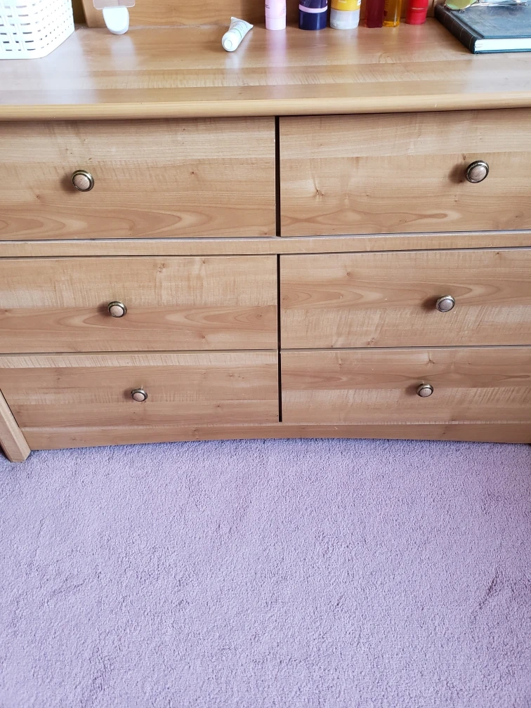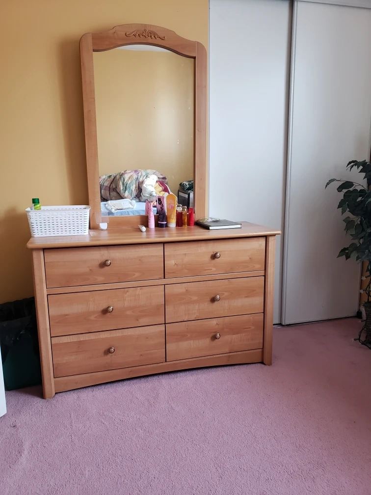 Wooden dresser, six drawers, attached mirror. Light brown finish. Good used condition.