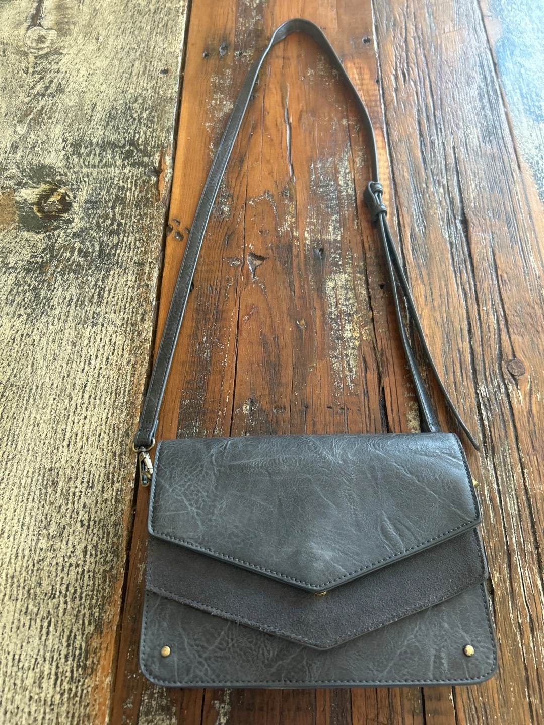 Beautiful grey crossbody bag. Features a long shoulder strap and flap closure. Small interior pocket. Excellent for everyday use.