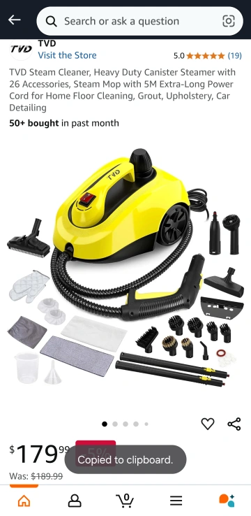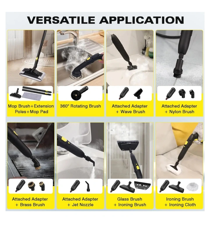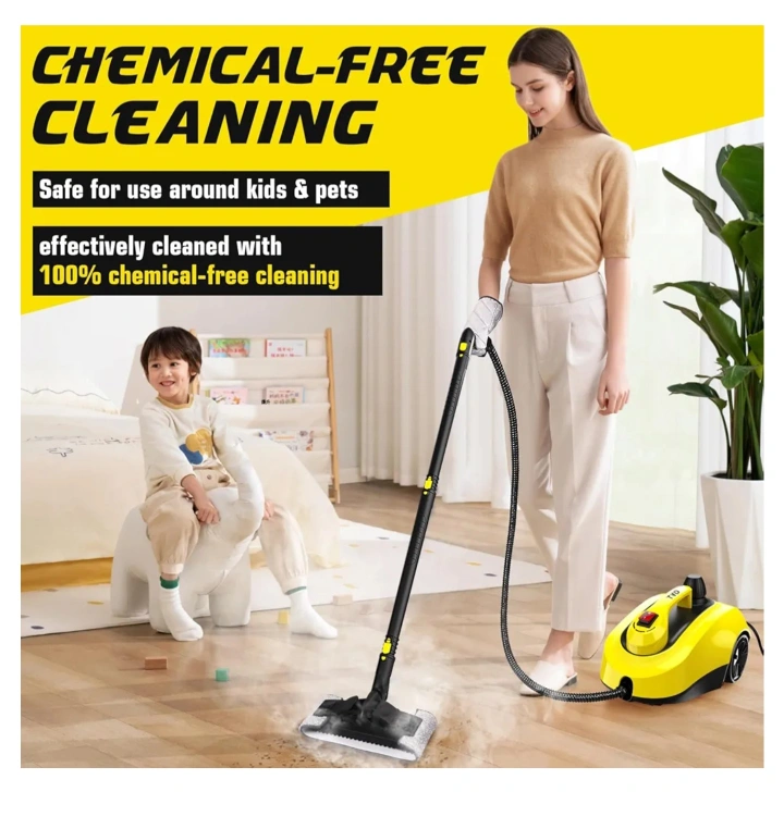 Powerful steam cleaner, yellow and black. Includes various attachments for cleaning floors, upholstery, and more. Chemical-free cleaning. Great for home use. Save 5%! Regularly $189.99.