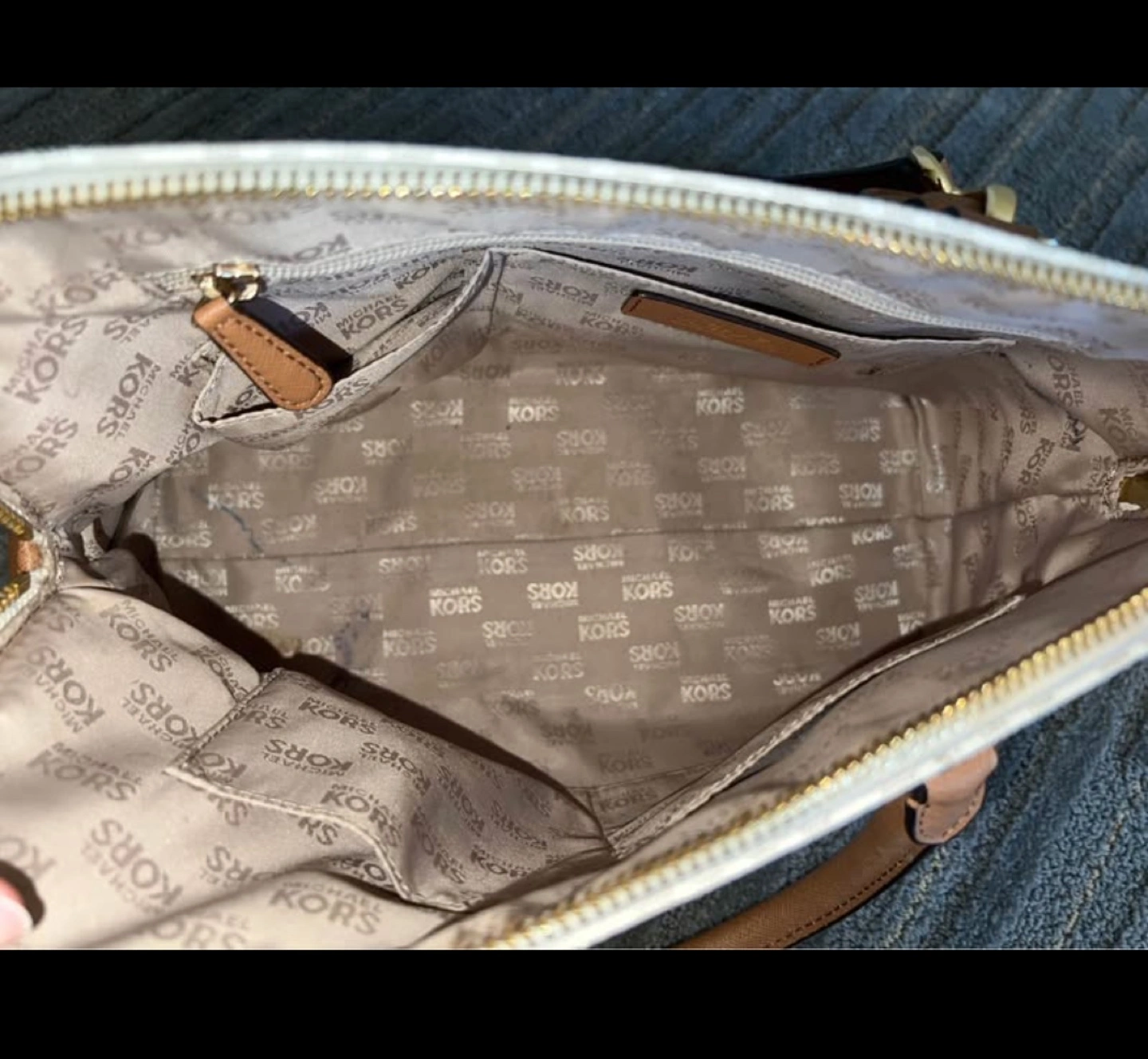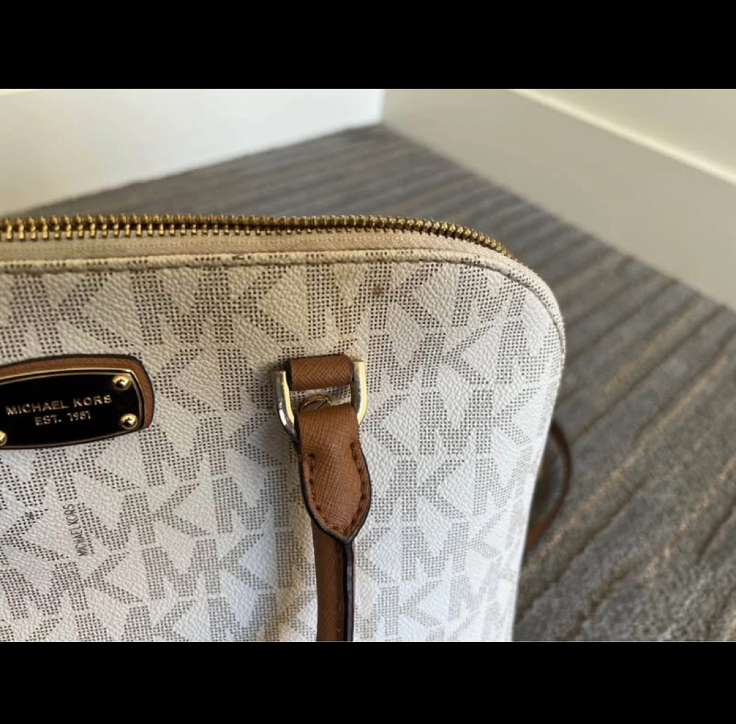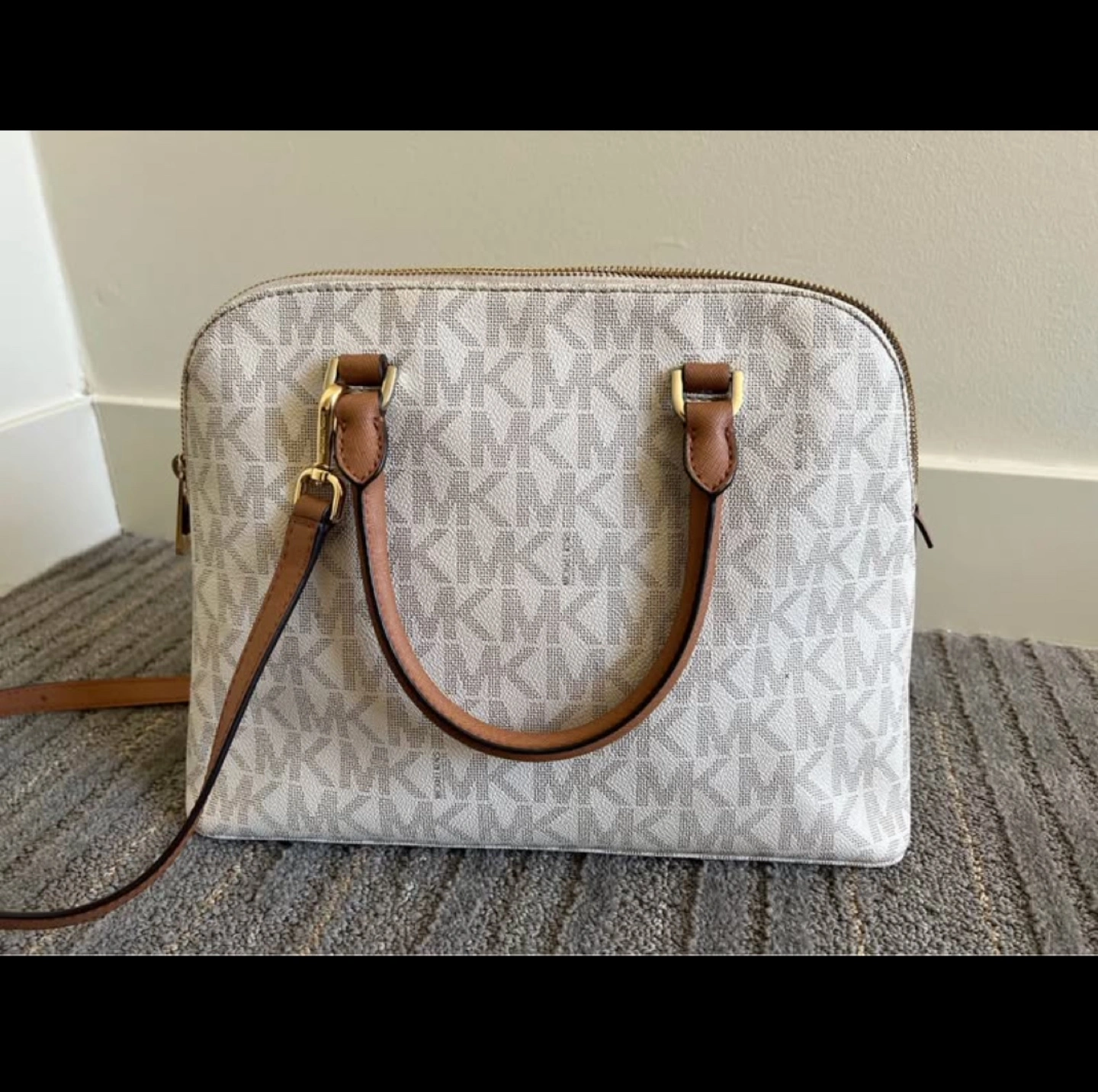 Cindy Dome satchel. MK signature print. Top zip closure. Double top handles and a removable shoulder strap. Interior needs some cleaning.