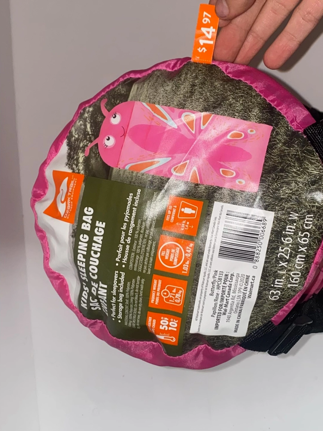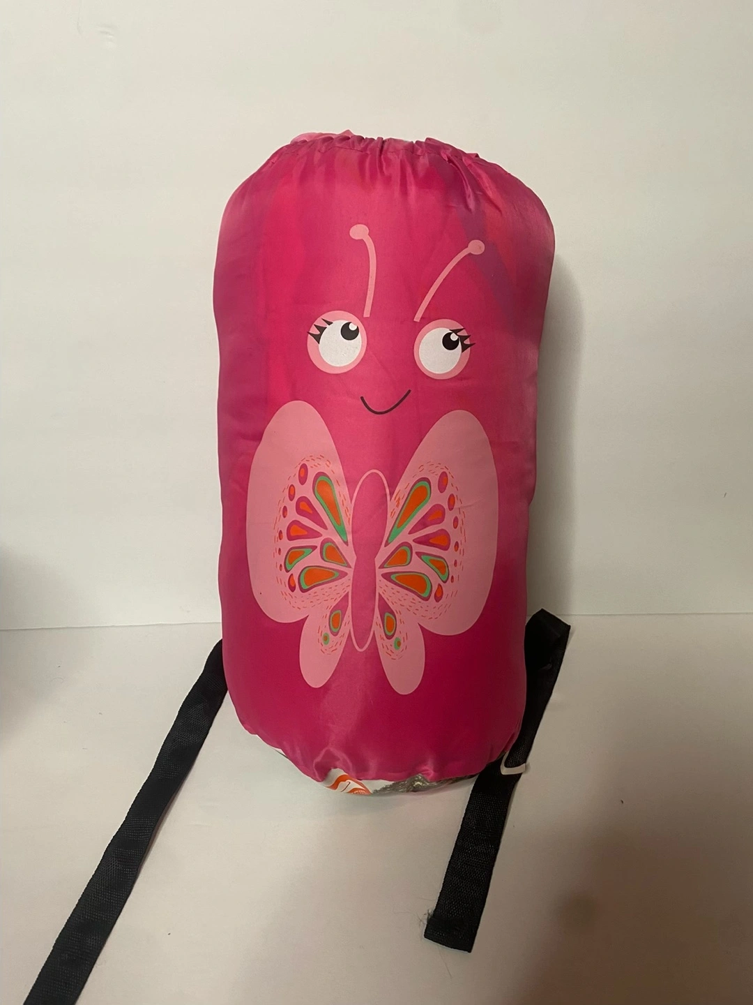 Lightweight kids sleeping bag. Pink with butterfly design. Portable and perfect for sleepovers.