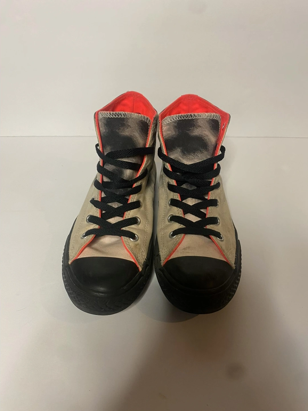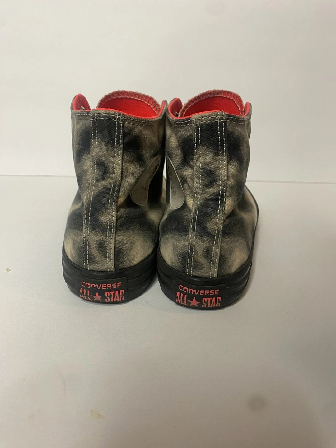Youth size 3.5 Converse Chuck Taylor All Star high-top sneakers. Unique tie-dye pattern. Black sole and orange inner lining.