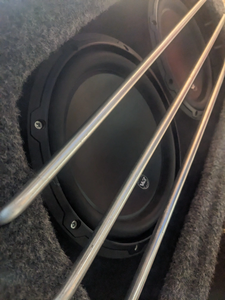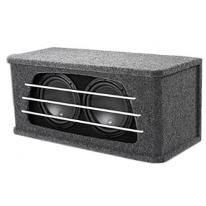 JL Audio High Output Enclosure. Dual 10 inch subwoofers. Grey carpet covering. Metal grill. Wedge design.