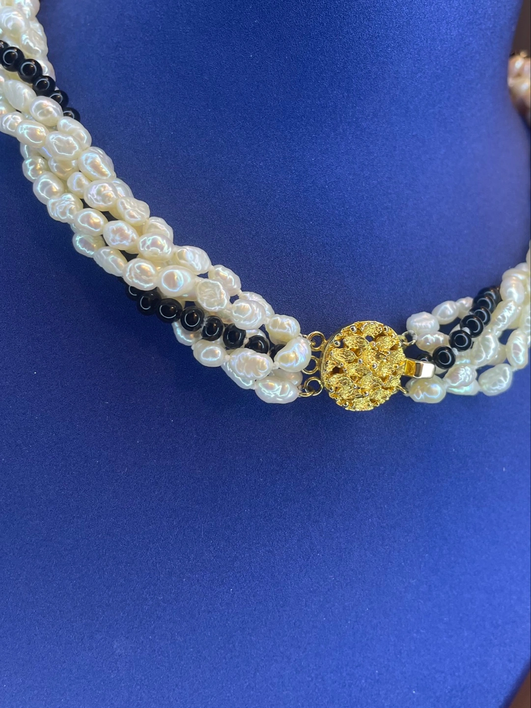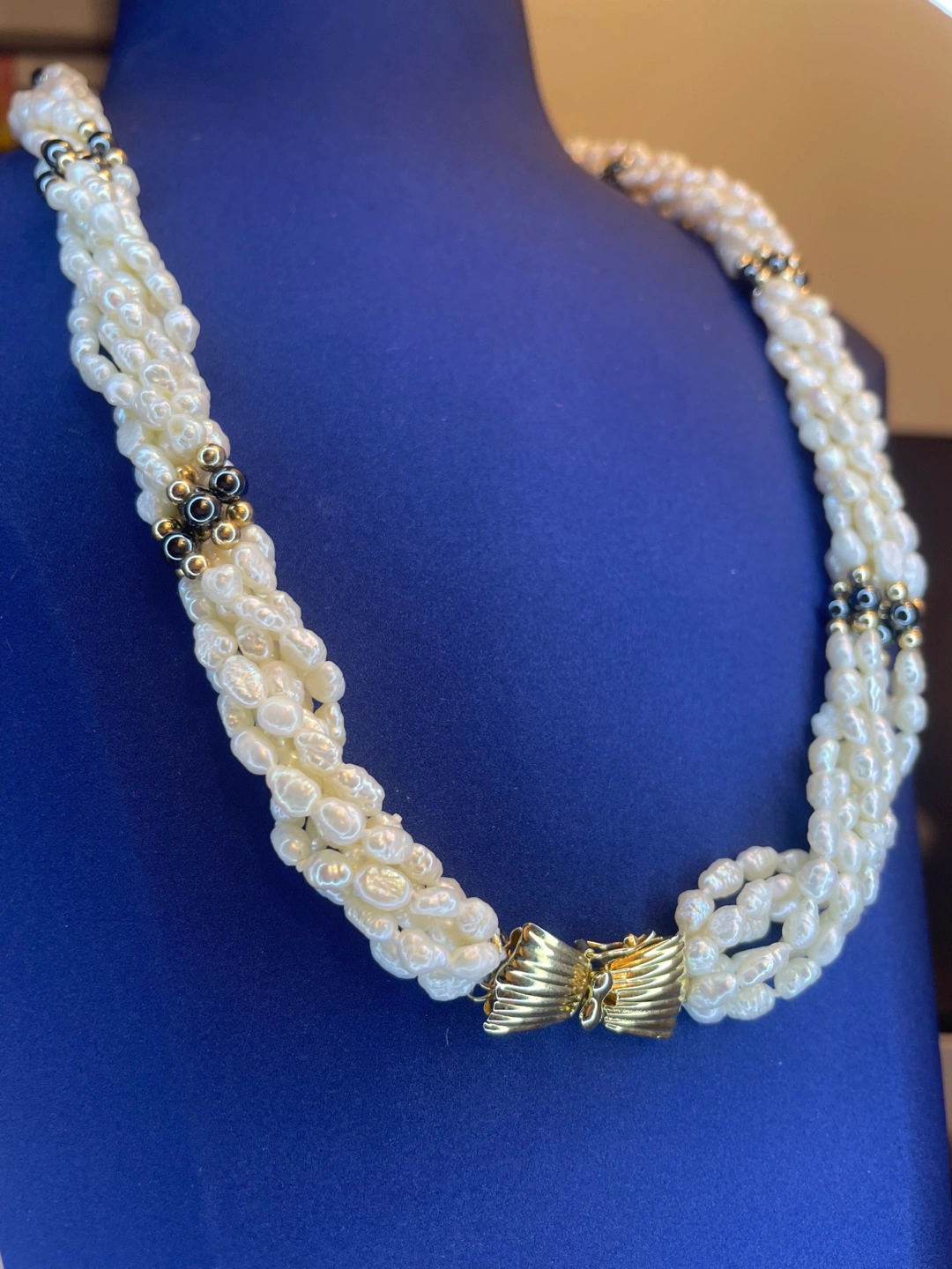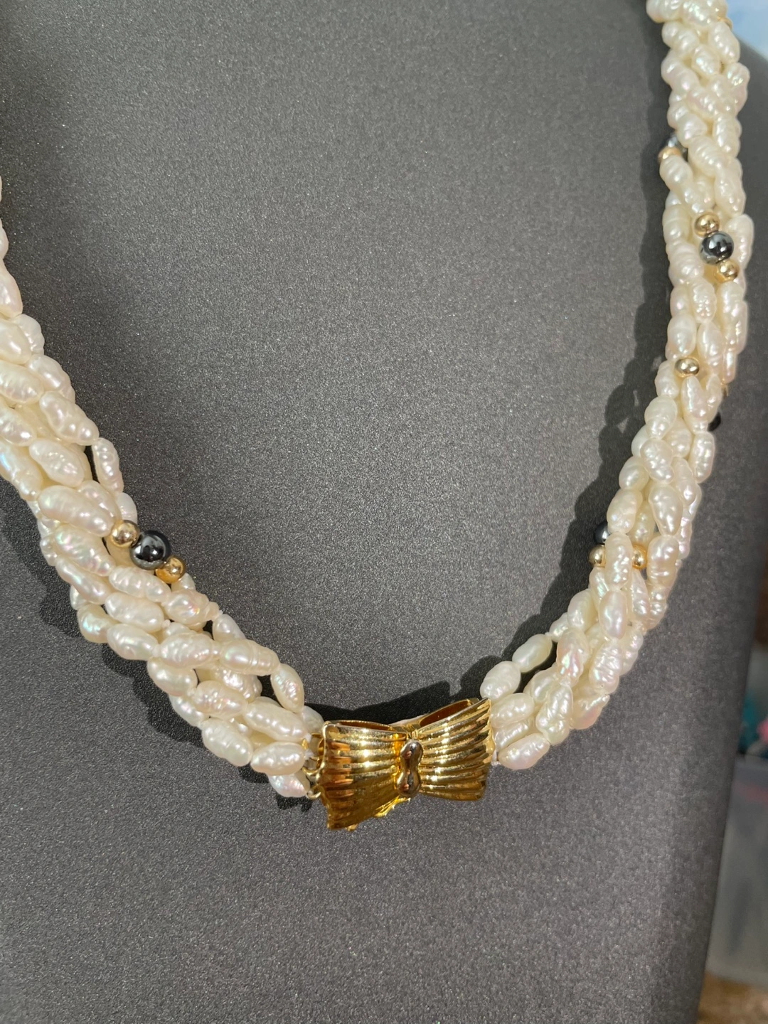 Elegant multi-strand necklace. Features creamy pearls, interspersed with gold and grey beads. Gold clasp. Lovely addition to any jewellery collection. Made in HK 30years ago. Just got these beautiful necklaces from a retired jewelry shop owner. All the necklaces are very well kept and new! The original prices are much higher and these pieces are truly vintage but totally new! Gift bags available for $10