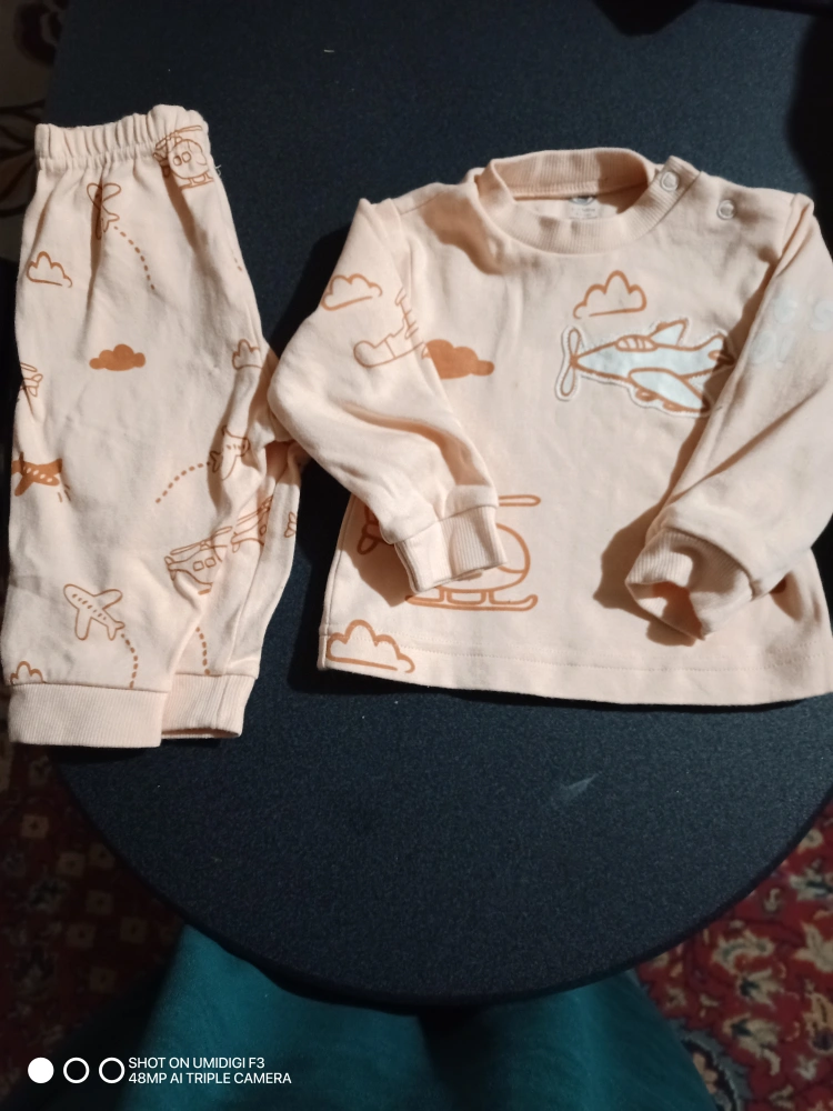 Adorable baby clothes set. Features a long-sleeved top and matching pants. Peach colour with a cute airplane and cloud print. Soft and comfortable cotton material. Perfect for your little one. 1-3 months with booties. Brand New