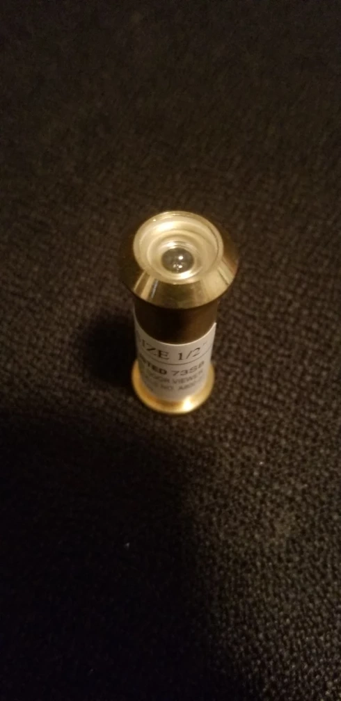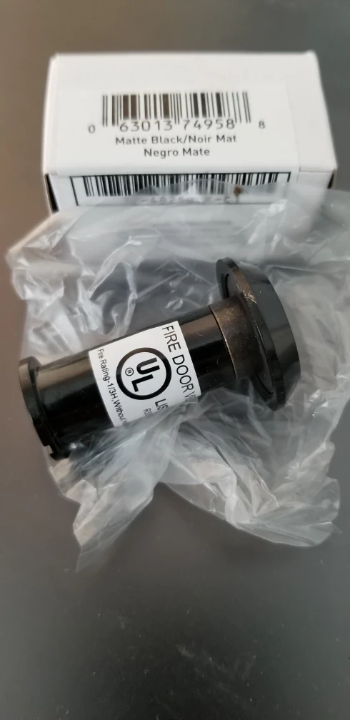 Brass or blac fire door viewer. Bore size 1/2". Model: A800-01. UL listed. 160 degrees viewing angle. Door thickness 33-50mm Matt black finish also available. 3 brass, two black available. $10 ea.