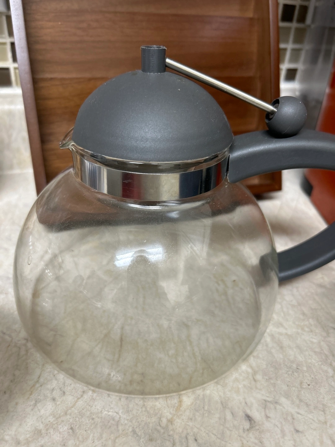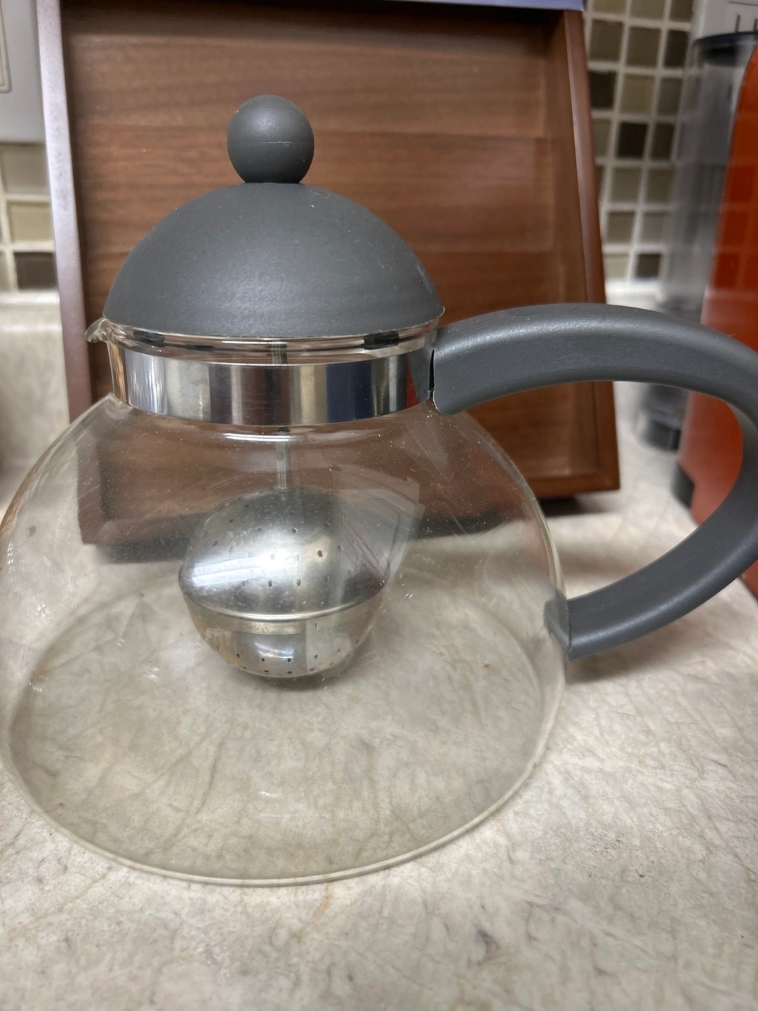 Clear glass teapot. Grey plastic lid and handle. Stainless steel infuser. Perfect for loose leaf tea.