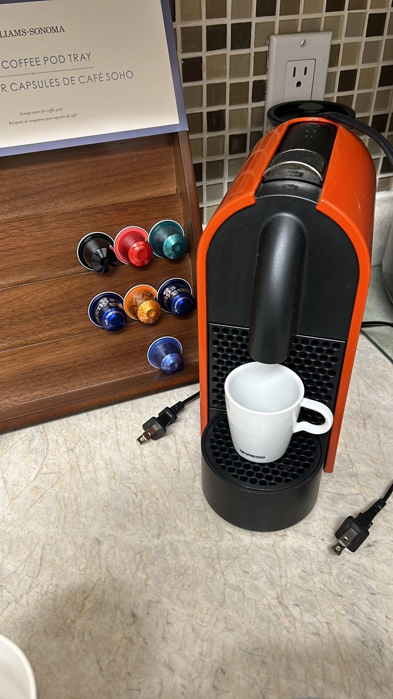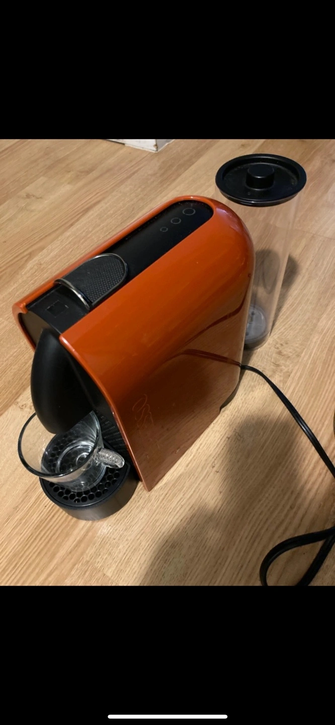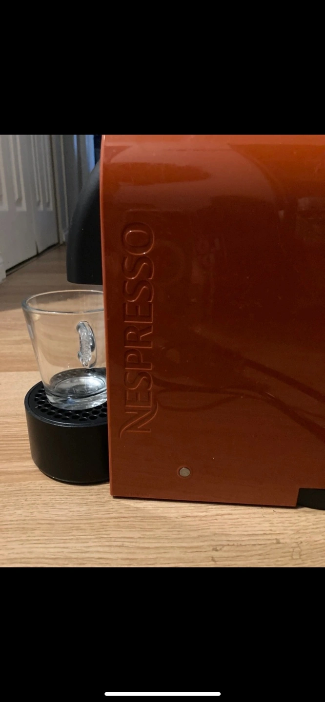 Nespresso coffee machine. Orange colour. Includes a water tank . Great for a small space. Nespresso cup 4$ Brand new Pod container 12 s