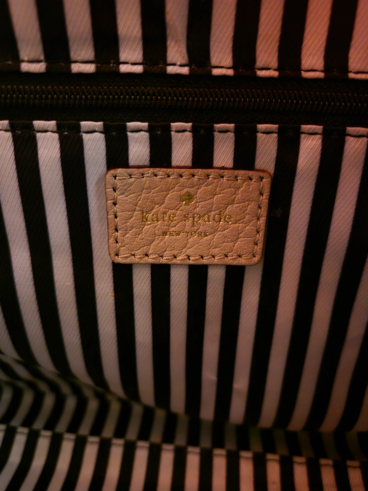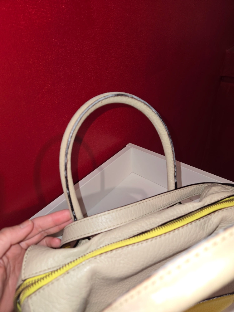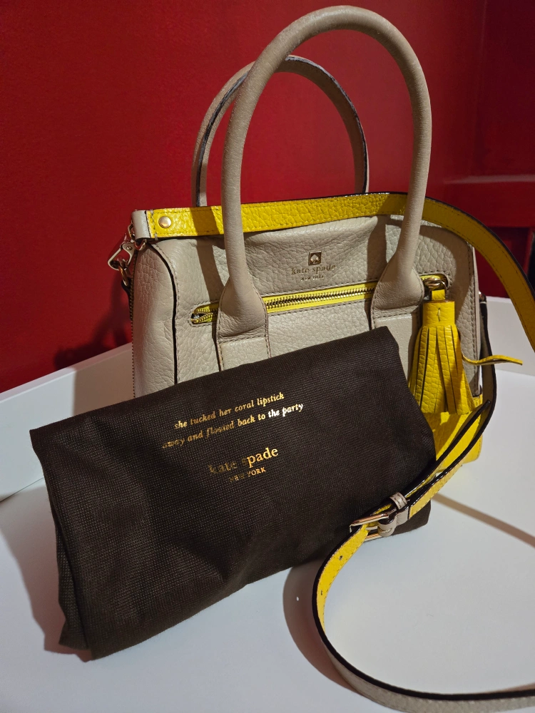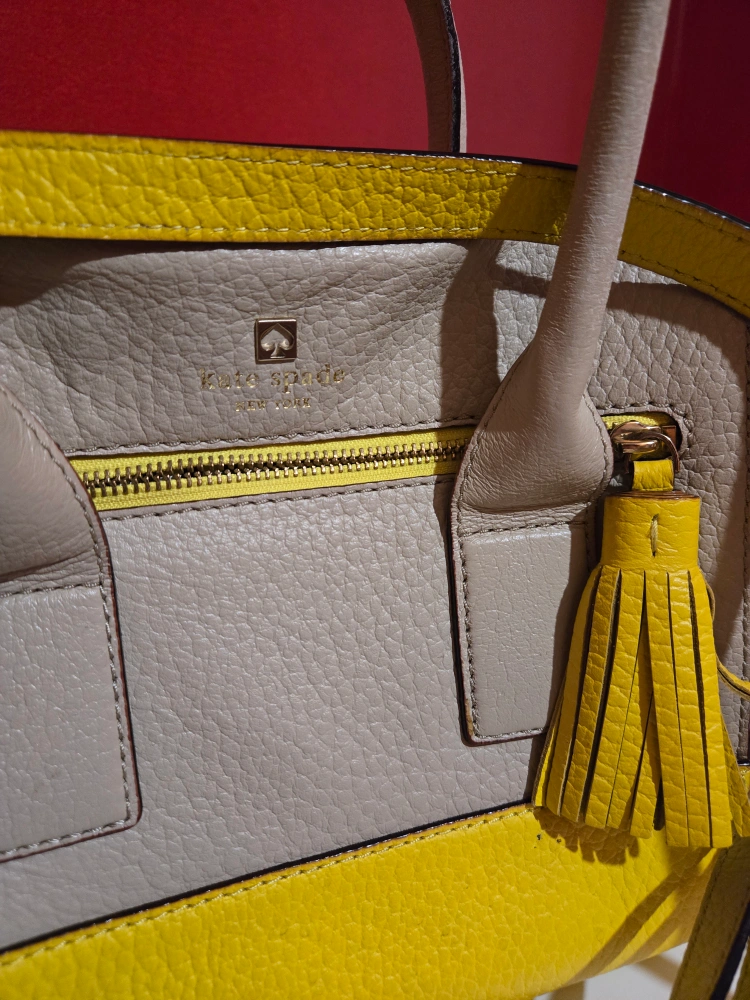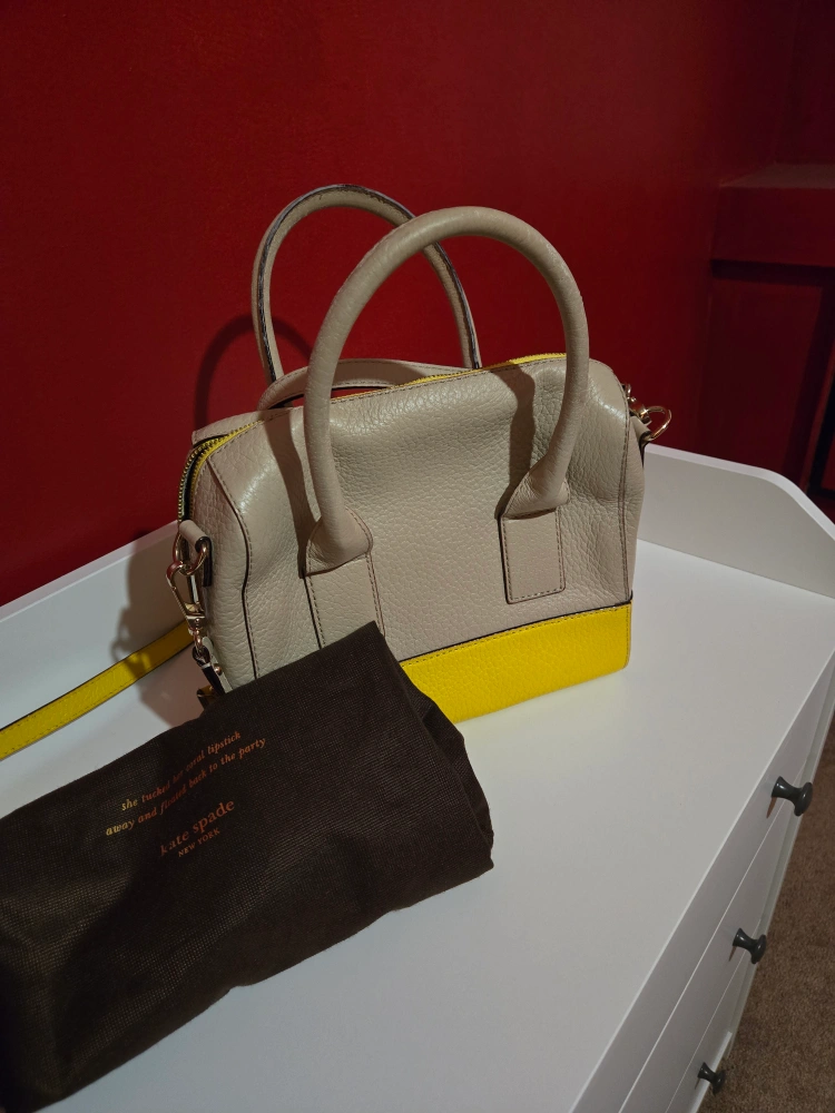 Beautiful Kate Spade New York handbag, beige and yellow leather. Includes a dust bag. Top handle and detachable shoulder strap. Two small interior pockets, and one interior zippered pocket. Small make up stains inside, and handles slightly worn. Otherwise in great shape. smoke free home.
