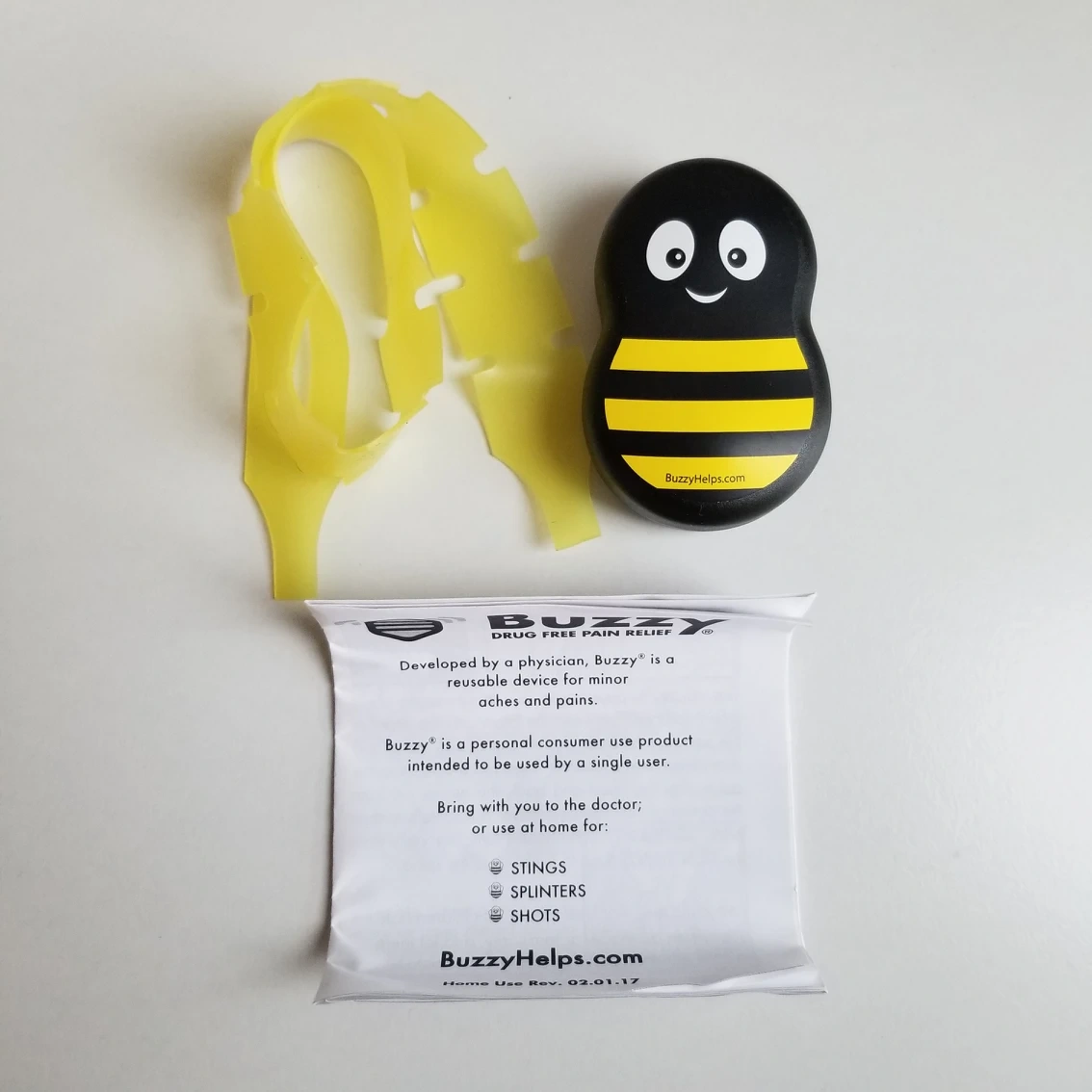 Buzzy 4 Pain is a pain relief device that uses cold and vibration to reduce pain from injections or needles. More information can be found here: https://paincarelabs.com/pages/buzzy This model retails for $60 USD. ***Please note that the ice wings are not included.
