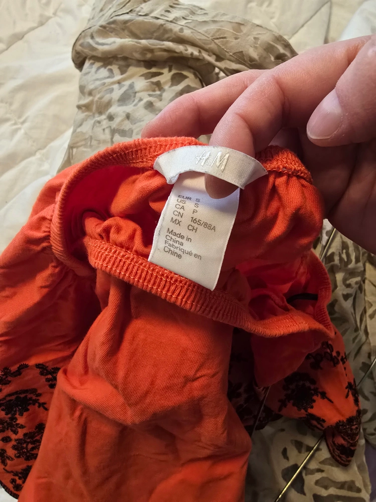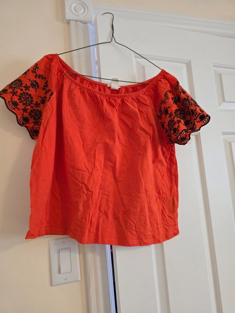 Cute orange cropped top. Off-the-shoulder style with black embroidered detailing on the sleeves. Size small.