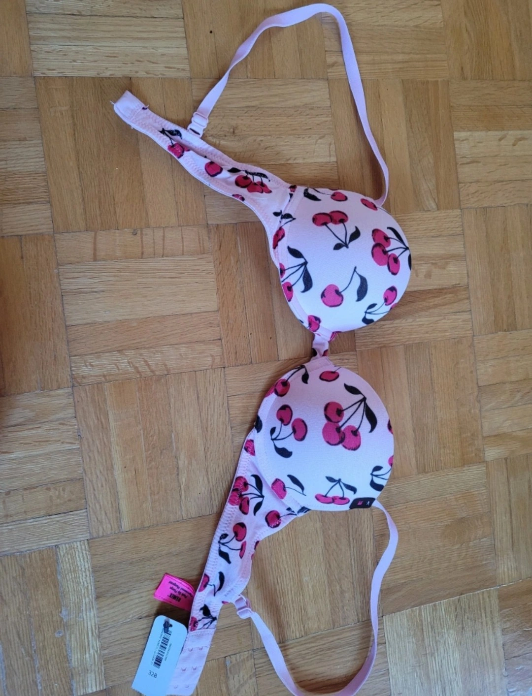 Lightly padded bra. Pretty cherry print on a pink background. Adjustable straps. Hook and eye closure. Brand new.