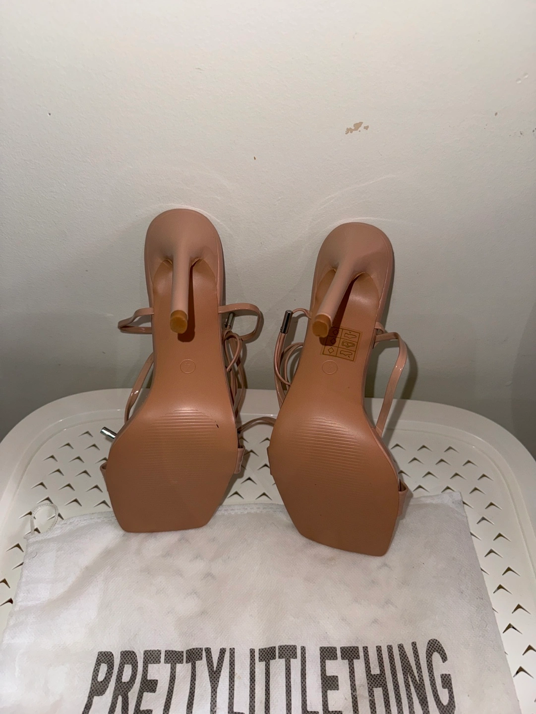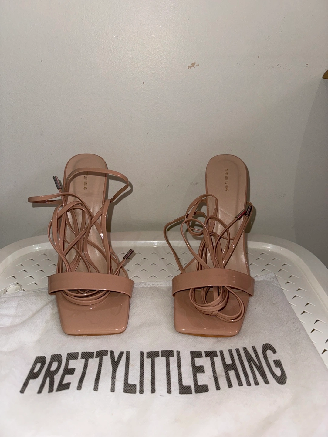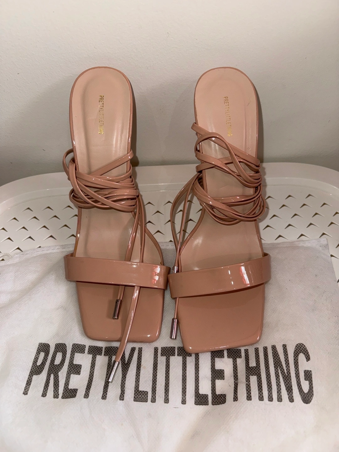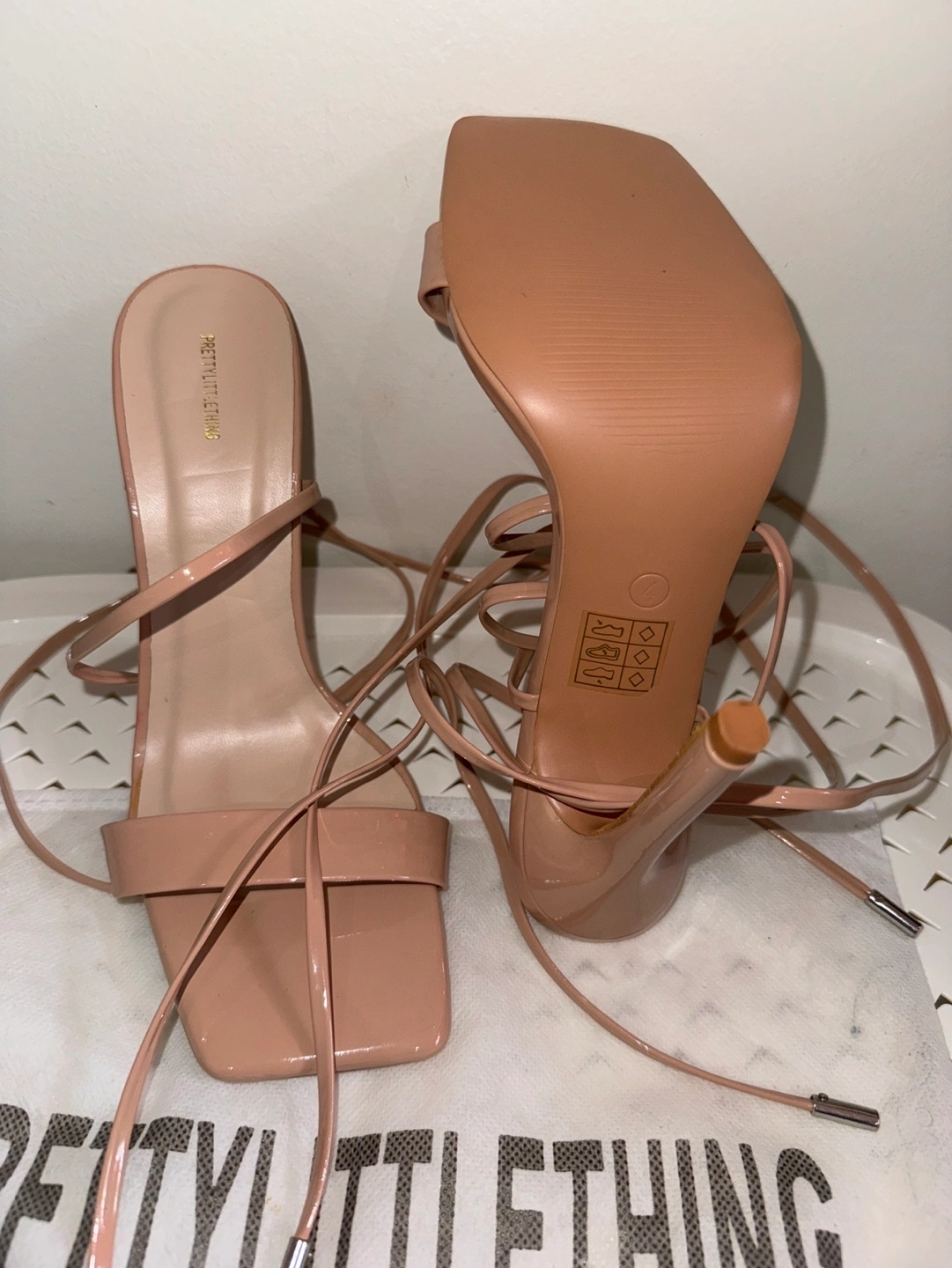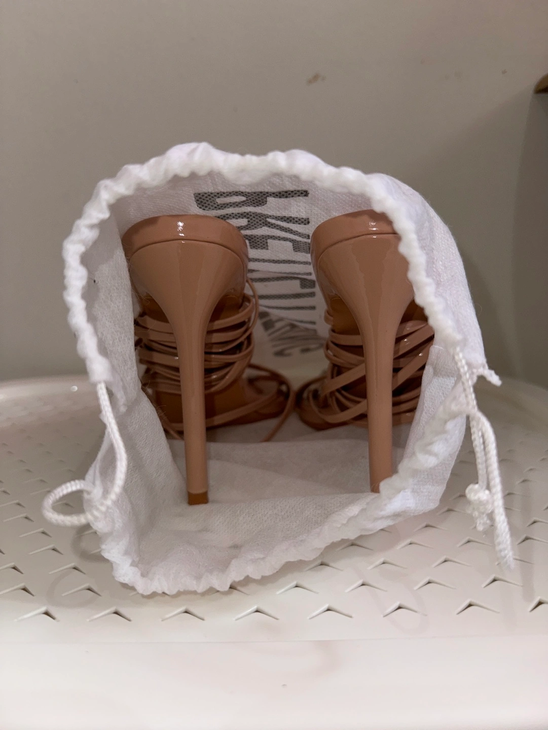Nude PU Patent Strap Lace Up High Heels. Square toe. Comes with dust bag.